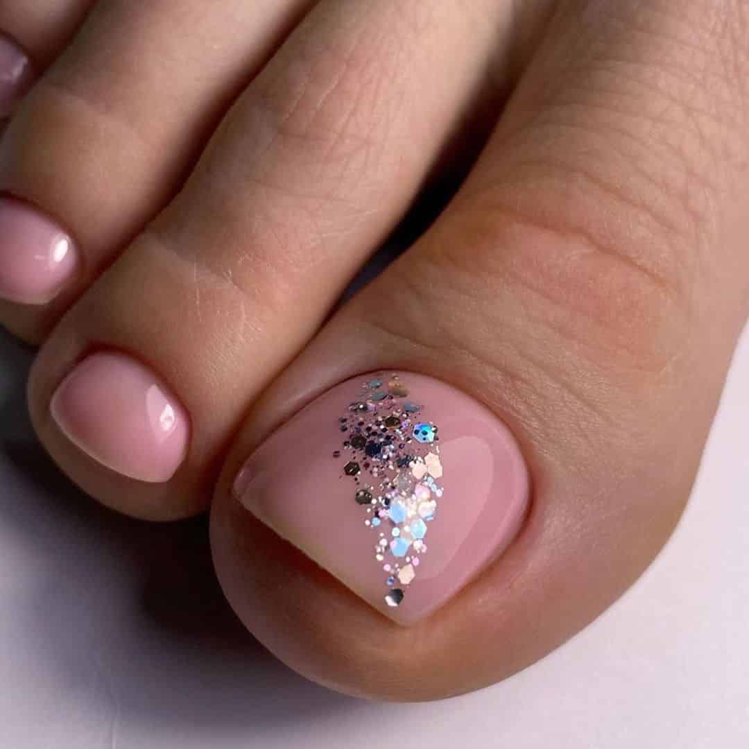 Мастера нейл-арта советуют применение в педикюре такой технологии, как растяжка блестками. Делается она с помощью специальной кисточки, а эффект на нежном покрытии ногтей получается просто потрясающим. На вечеринке блестки будут переливаться на свету, а в повседневной жизни добавят вашему образу немного блеска и яркости.