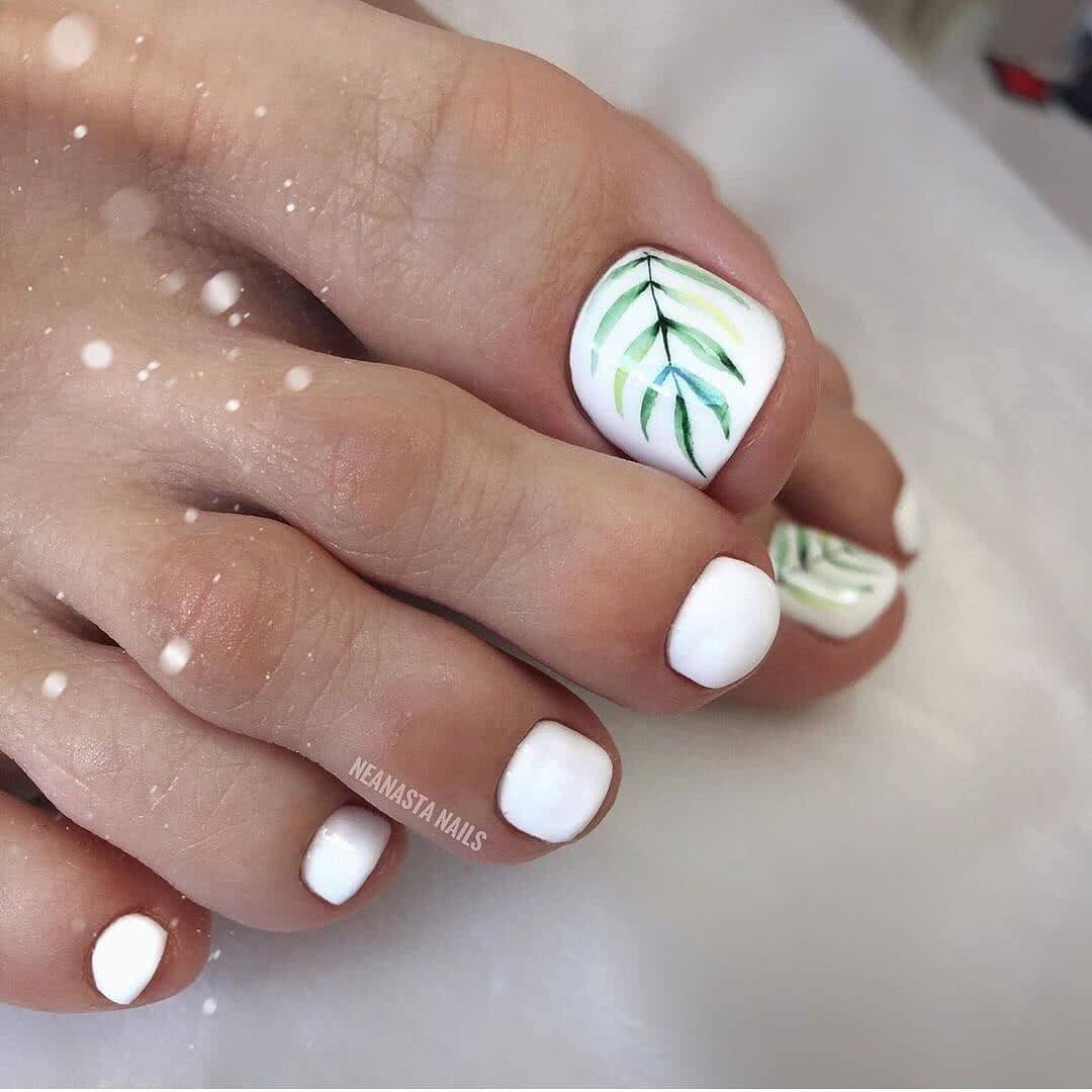 Если однотонный вариант белого педикюра кажется скучноватым, его вполне уместно «оживить» цветочным принтом, рисунками растений. Мелкие, крупные, часть цветов рисуют на каждом ногте, нескольких, но все же оригинальнее в педикюре создать цветы только на одном ногте большого пальца. Чтобы облегчить процесс, используют дотс, благодаря которому создание пятилистников – дело пяти минут. Также хорошим подспорьем может быть стемпинг, наклейки.