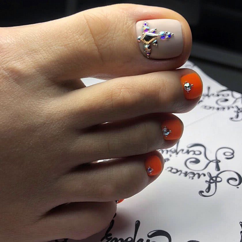 Декорирование стразами. Несмотря на то, что разноцветное покрытие смотрится завершенным и самодостаточным, его можно сделать еще более привлекательным при помощи стеклянных камешков. Наиболее популярно украшение стразами, выполненное только на пластинах больших пальцев ног.