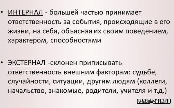- Экстернальный. Считает, что всё в его жизни происходит по стечению обстоятельств или из-за внешних факторов. Инфантилен, конфликтен.