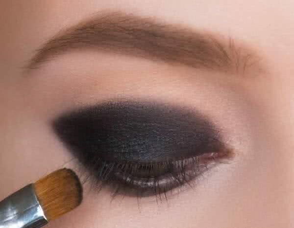 Выбираем самые тёмные тени из палитры, рекомендуется использовать оттенки чёрного с ярким подтоном, например, фиолетовым. Наносим тени на подвижное веко более толстым слоем к ресницам, слегка растушёвывая края. Стараемся сформировать аккуратную заострённую петлю у внешнего уголка глаза, лишь слегка выходя за его пределы.