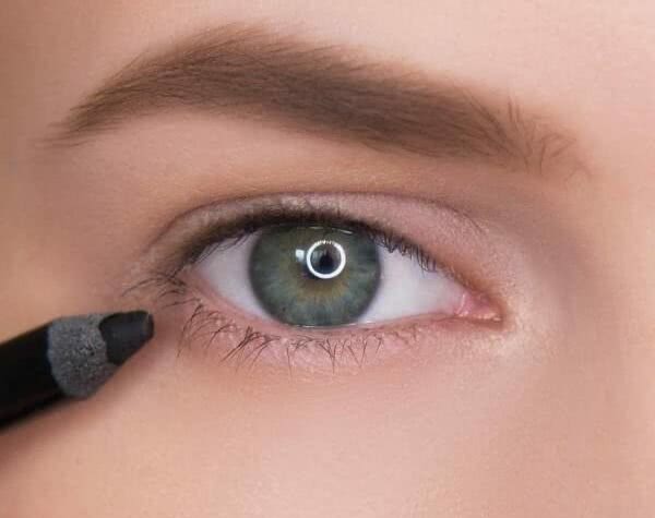 Аккуратно прорисовываем тонкую полоску по линии роста ресниц на верхнем веке. Для этого можно использовать мягкий чёрный карандаш. Линия не должна выходить за пределы века или ресниц, лишь подчёркивать их у основания.