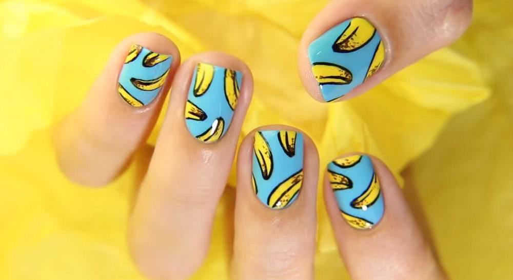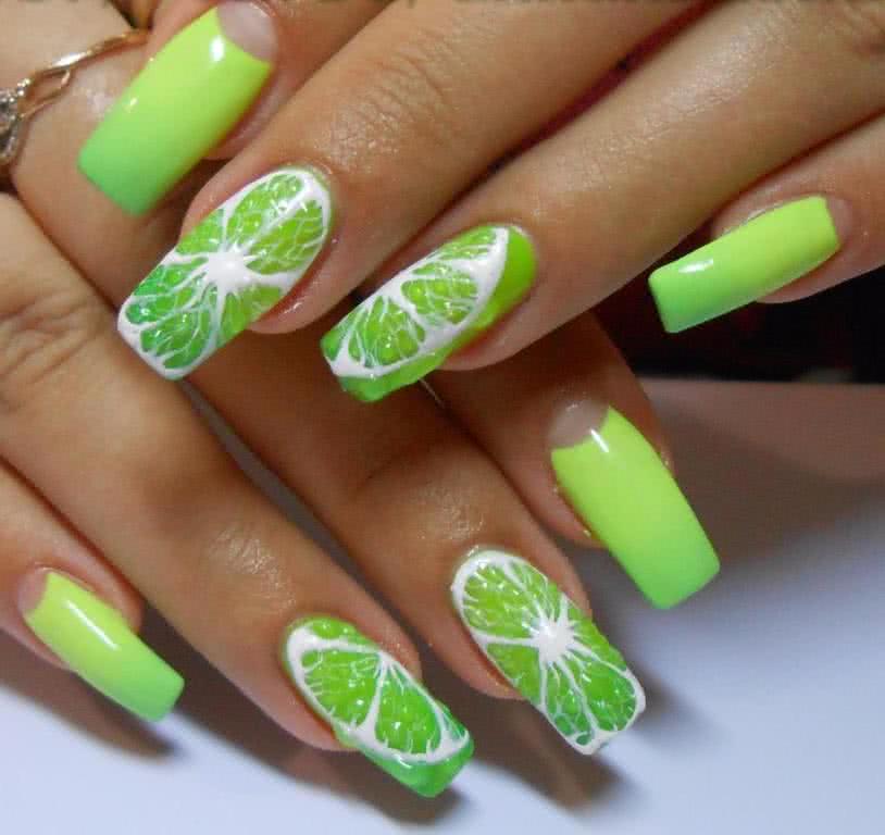 Модным будет украшать ногтевую пластину изображением фруктов. Это могут быть наклейки или объемные микроскопические изделия из специальной глины