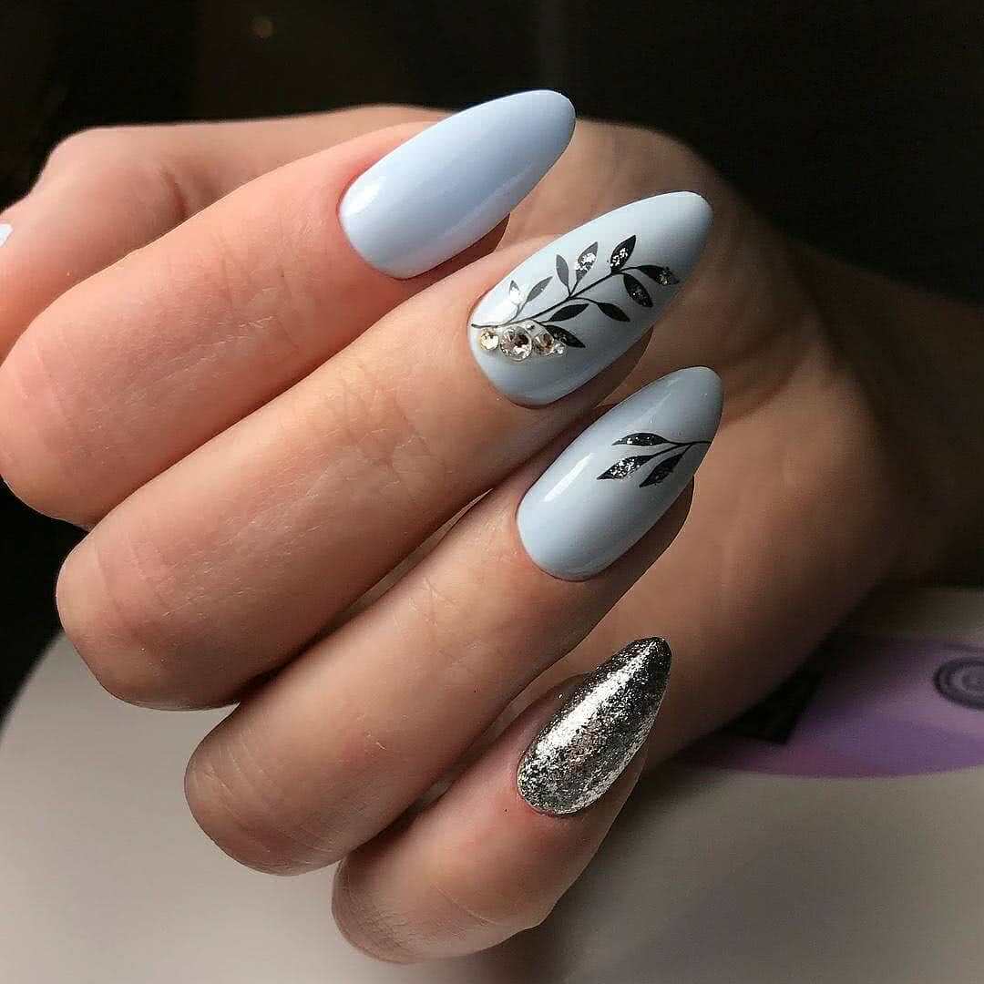Выбирая оттенки по тому же принципу, что и в летнем маникюре, стоит остановить свое внимание на белоснежном лаке и сине-голубой палитре. Также актуальными будут всевозможные серебристые покрытия