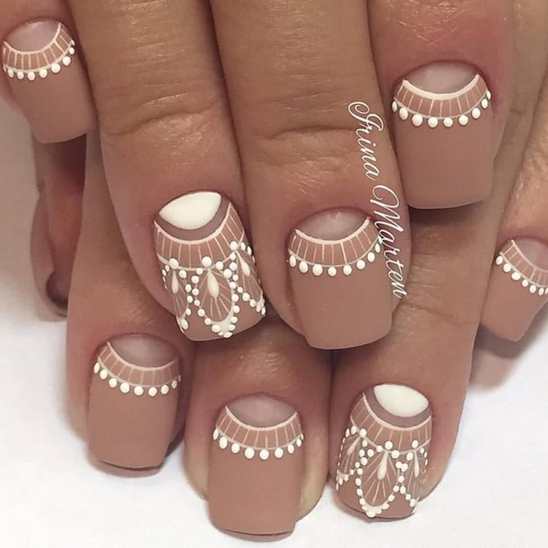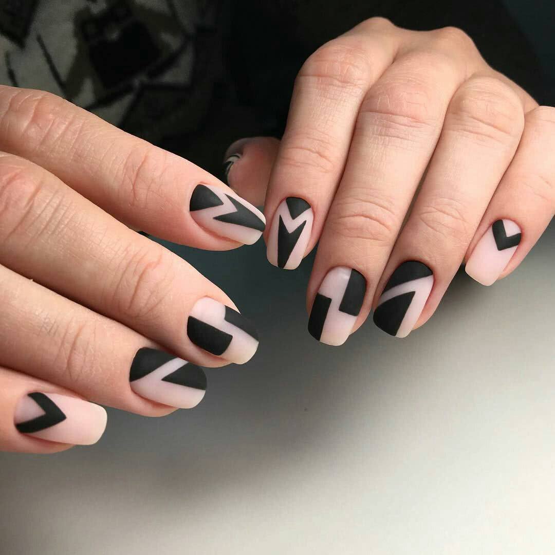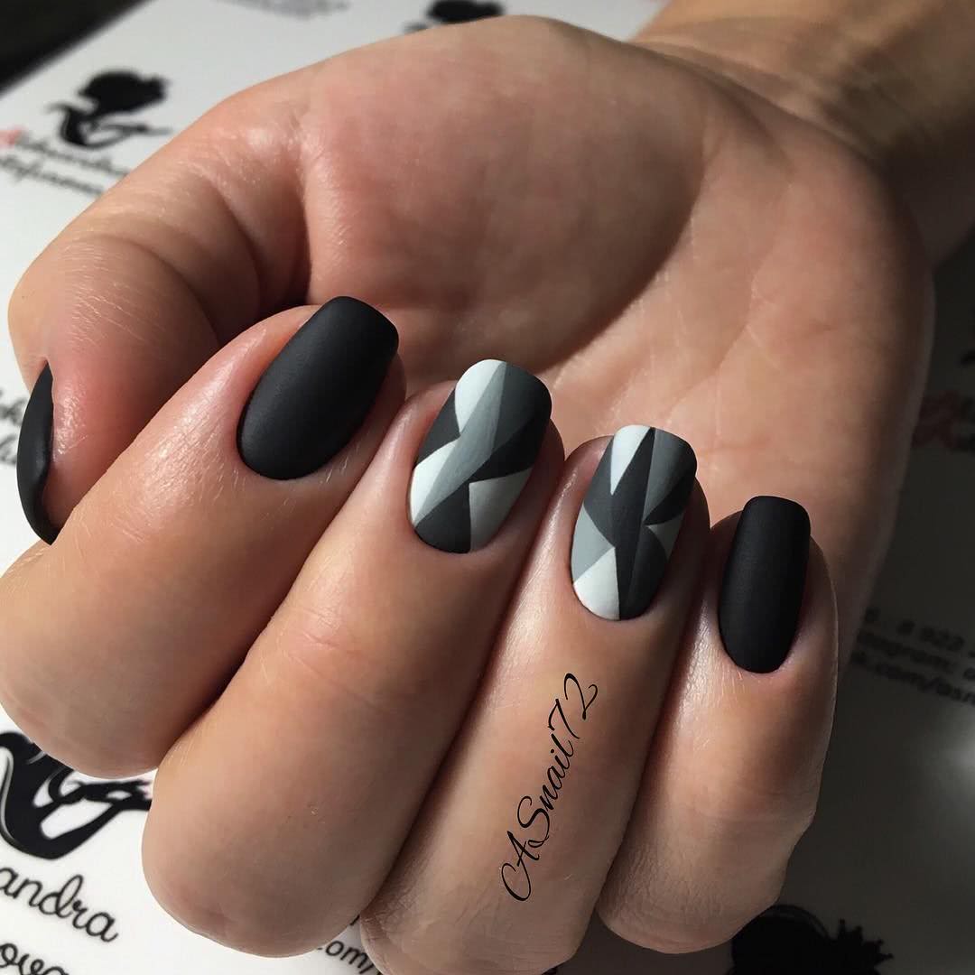 На коротких ногтях неплохо смотрятся геометрические орнаменты. Прекрасно дополнят матовый маникюр небольшие узоры в одной части ногтя.