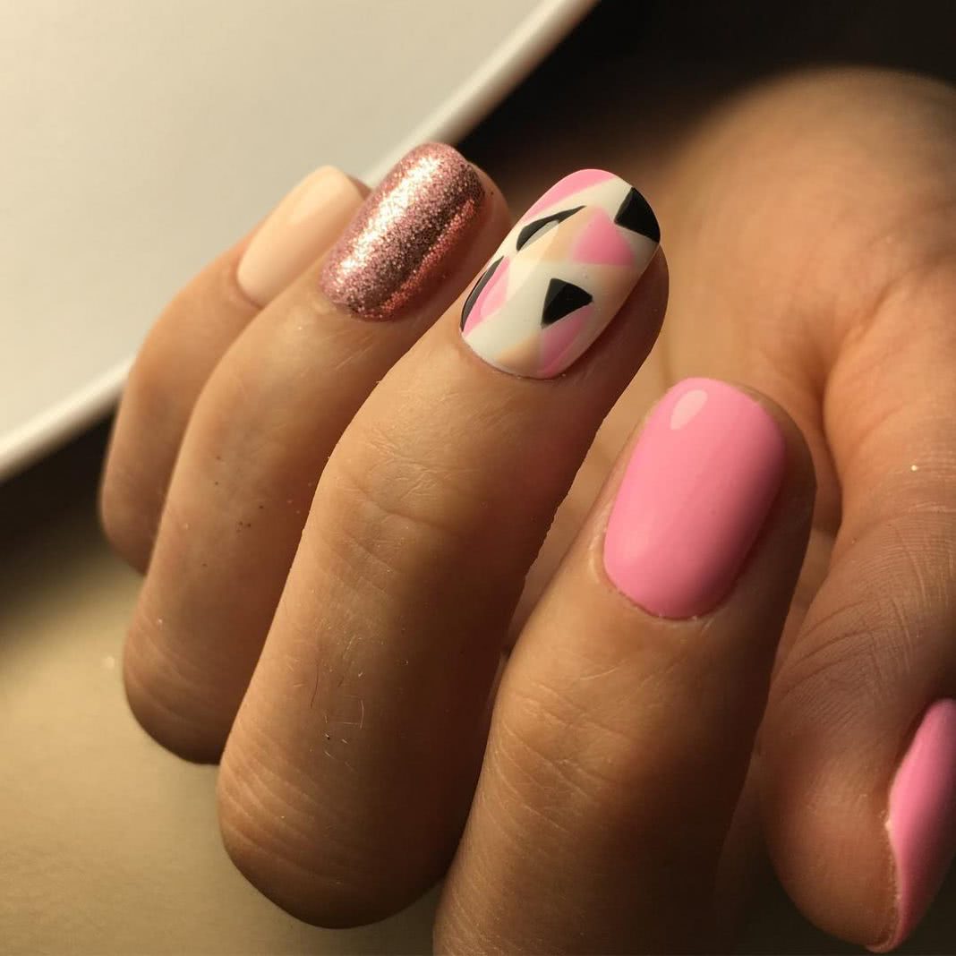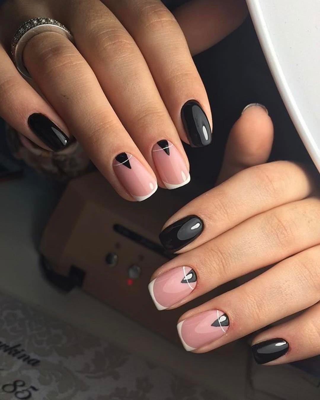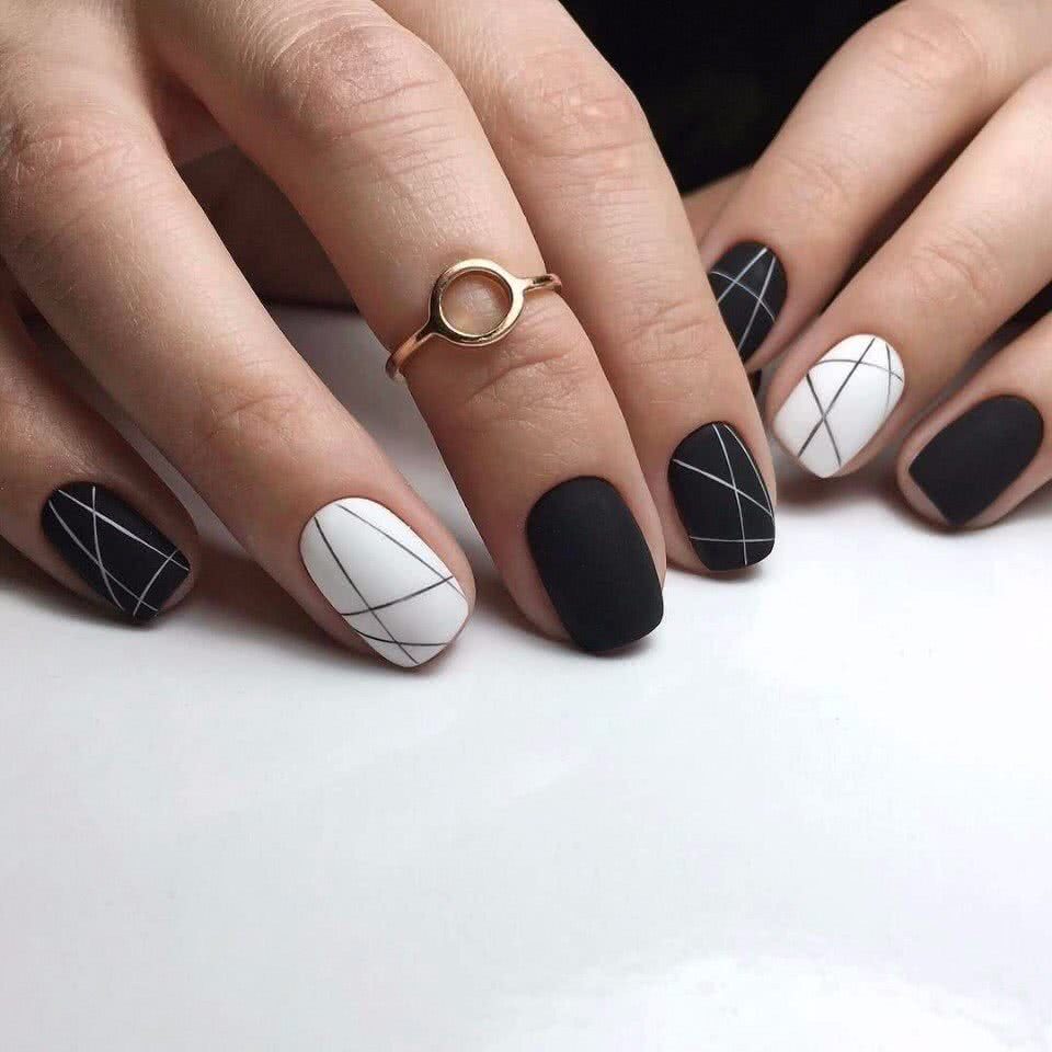 На коротких ногтях неплохо смотрятся геометрические орнаменты. Прекрасно дополнят матовый маникюр небольшие узоры в одной части ногтя.