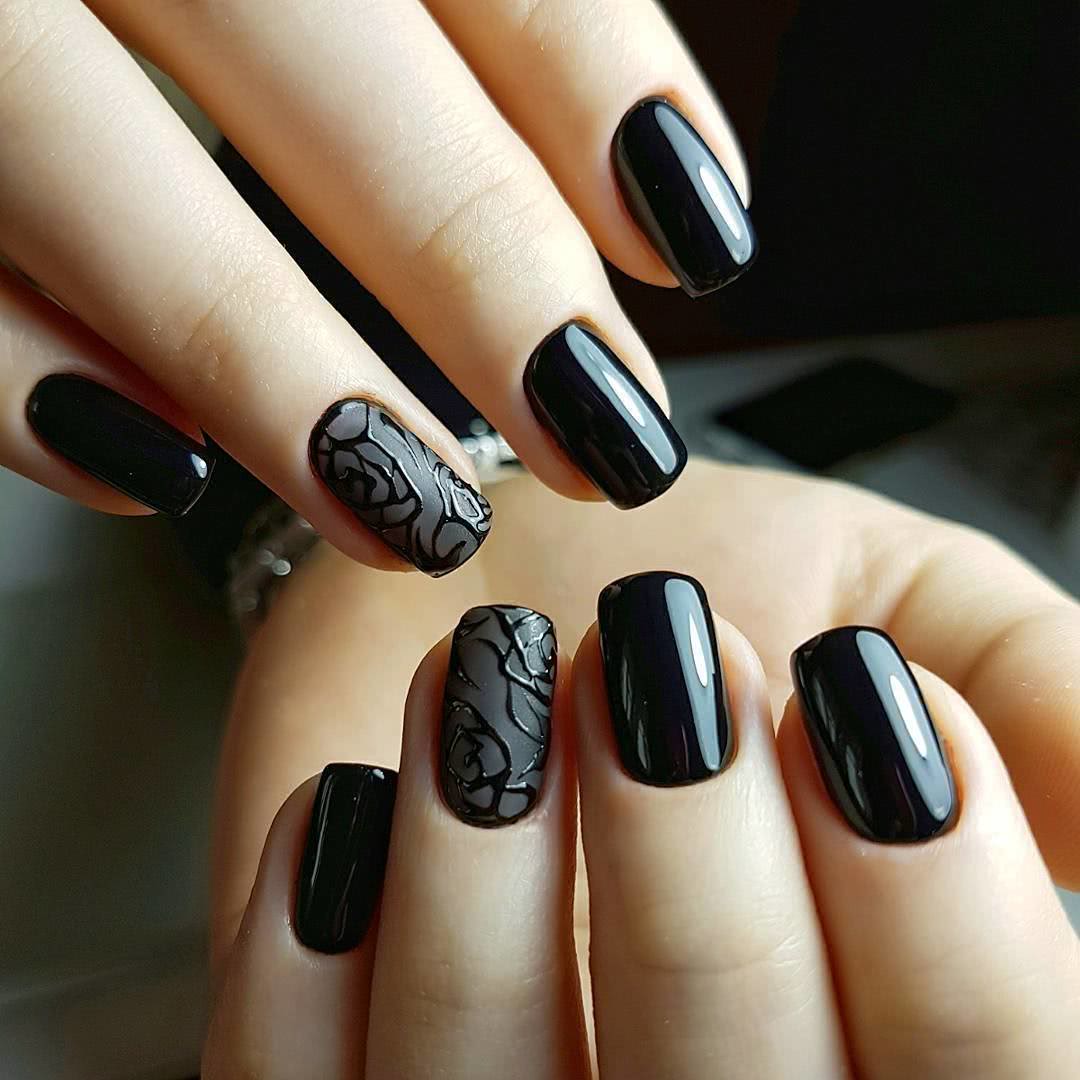 Черный дизайн великолепно смотрится на коротких ногтях миндалевидной и квадратной формы. Что касается фактуры, то неоспоримым лидером сезона считается глянцевый лак. Черный цвет весьма капризно относится к сочетаниям, поэтому единственным дополнением темного дизайна могут стать золотые блестки и другой «металлический» декор.