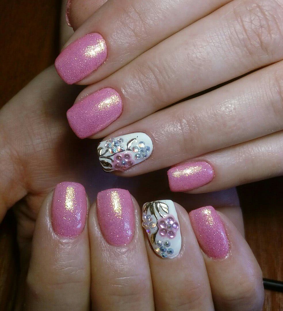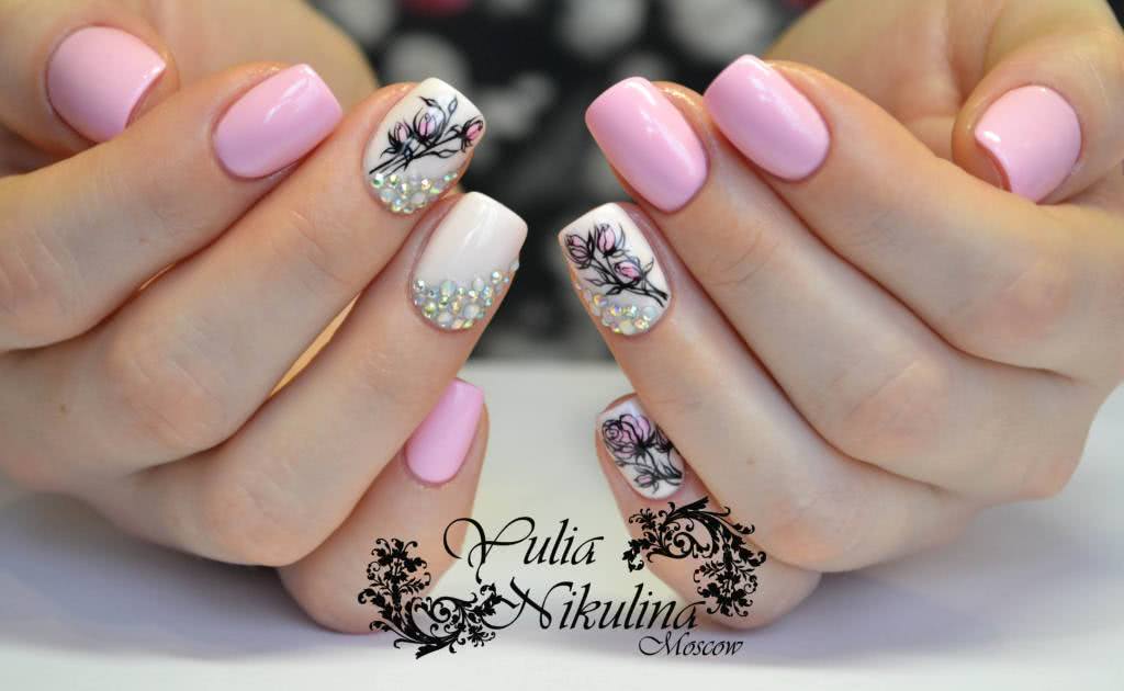 Великолепно смотрится сочетание глянцевого и матового лака, где цветы выполнены в бархатном напылении и украшены мелкими стразами