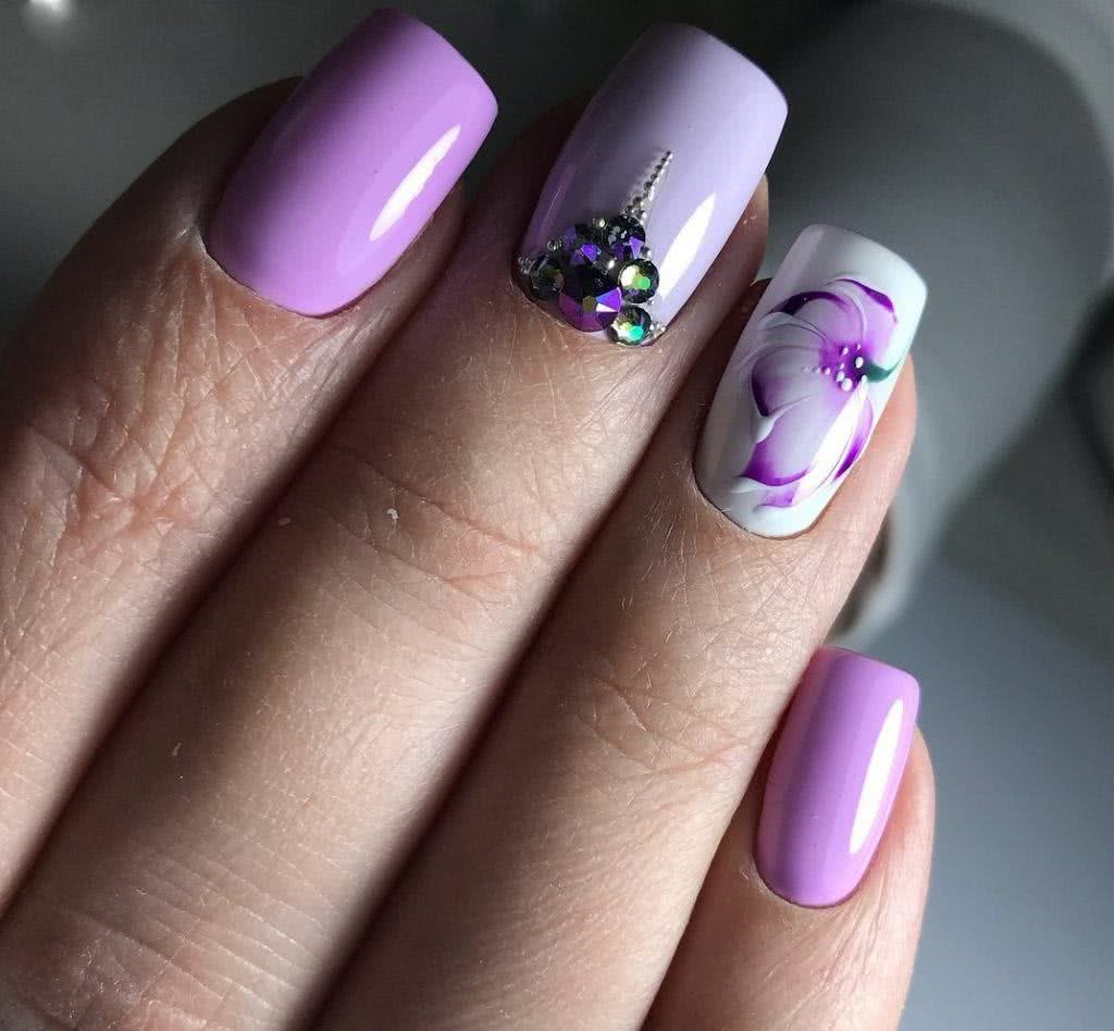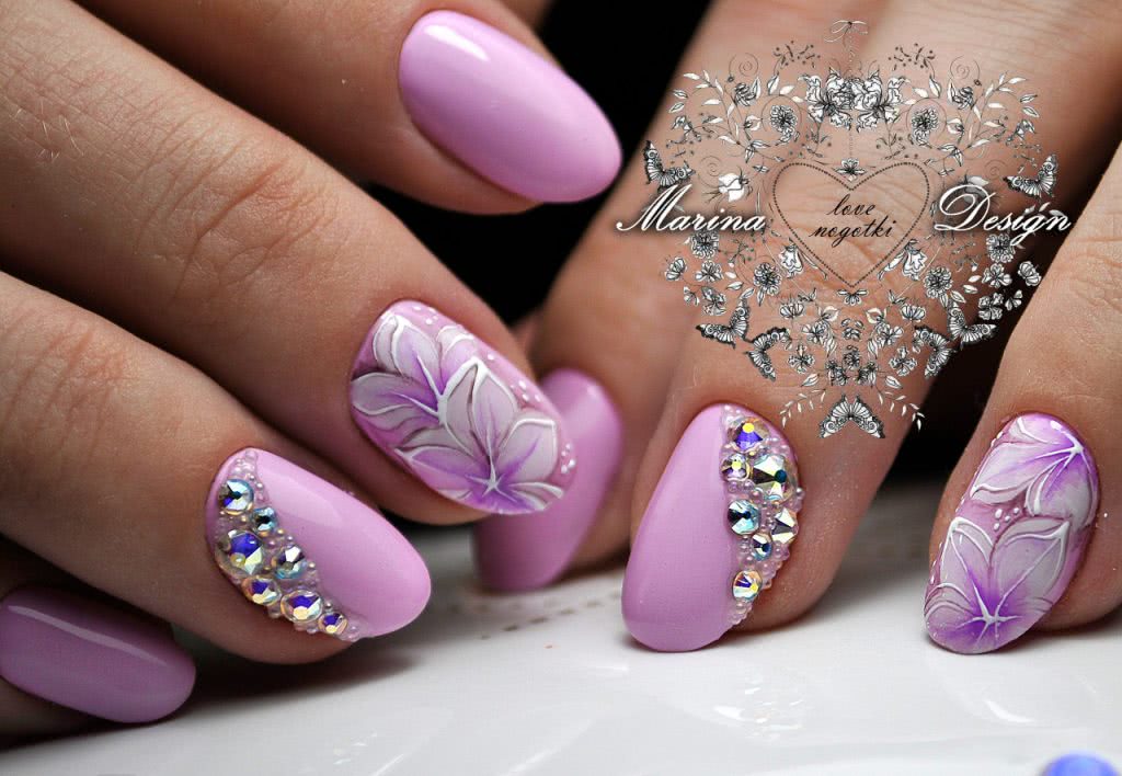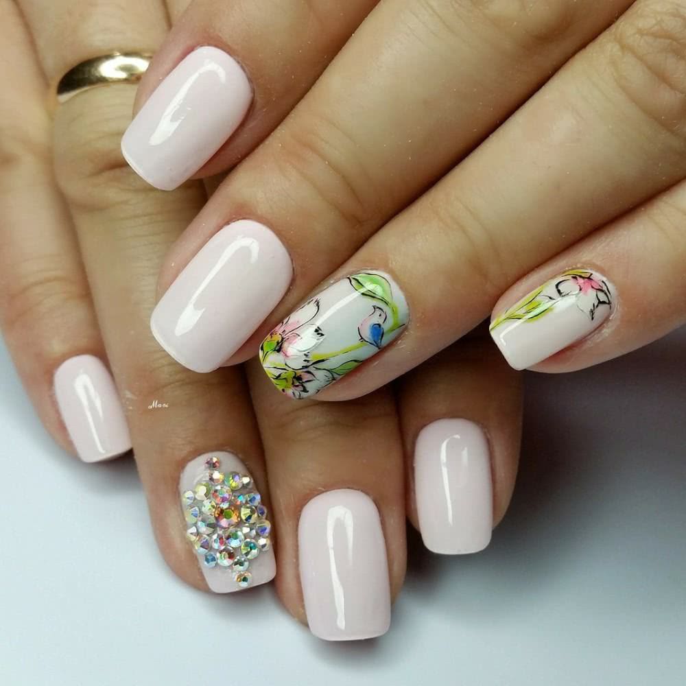 Для цветочного маникюра используйте камни маленького размера, ведь они не должны отвлекать внимание от основного флористического узора