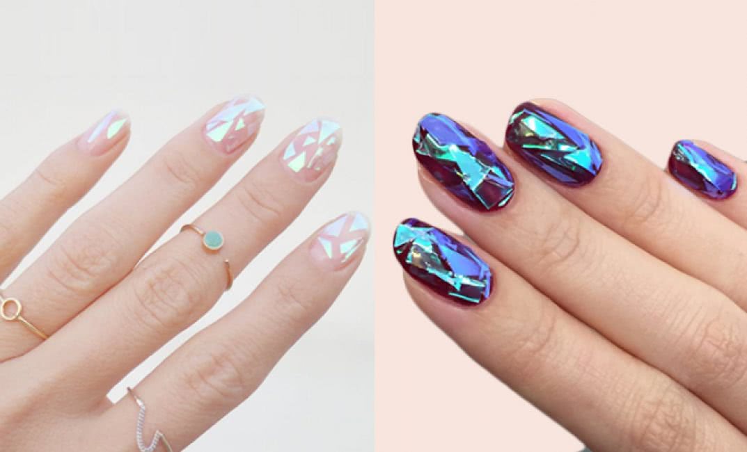 Поскольку эффект битого стекла в маникюре полюбился многим в прошлом сезоне, закономерен факт того, что он перекочевал в нынешний. Подходит абсолютно всем – возраст и стиль здесь не играет роли вообще. Работать с материалом очень легко. Для его создания достаточно купить специальную фольгу или целлофан с голографической фактурой. Порезать его кусочками и уложить на палец по своему усмотрению. Сверху покрыть слоем прозрачного лака. Световой поток, попадая на ноготь будет преломляться, создавая тем самым самые причудливые варианты игры света, напоминающие отблески драгоценных камней.