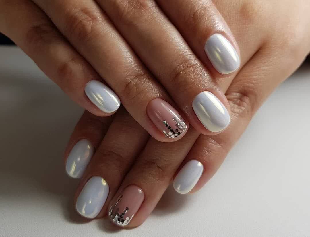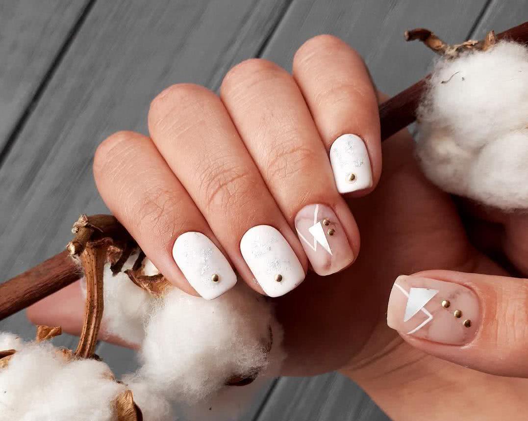 - белый – универсальный цвет, который особенно уютно выглядит зимой. В тренде как однотонное покрытие ногтей, так и декор акриловой пудрой, глиттером, фольгой.
