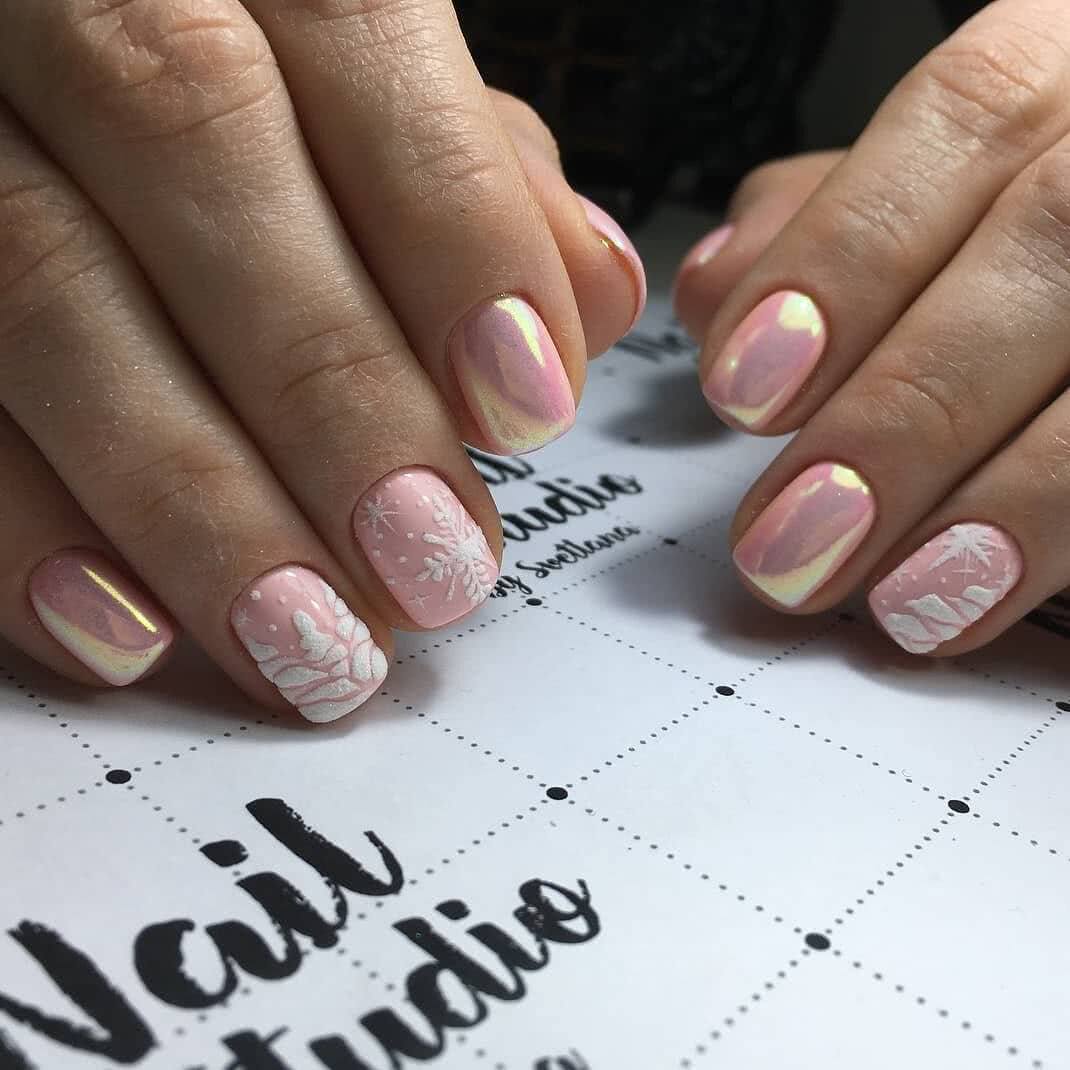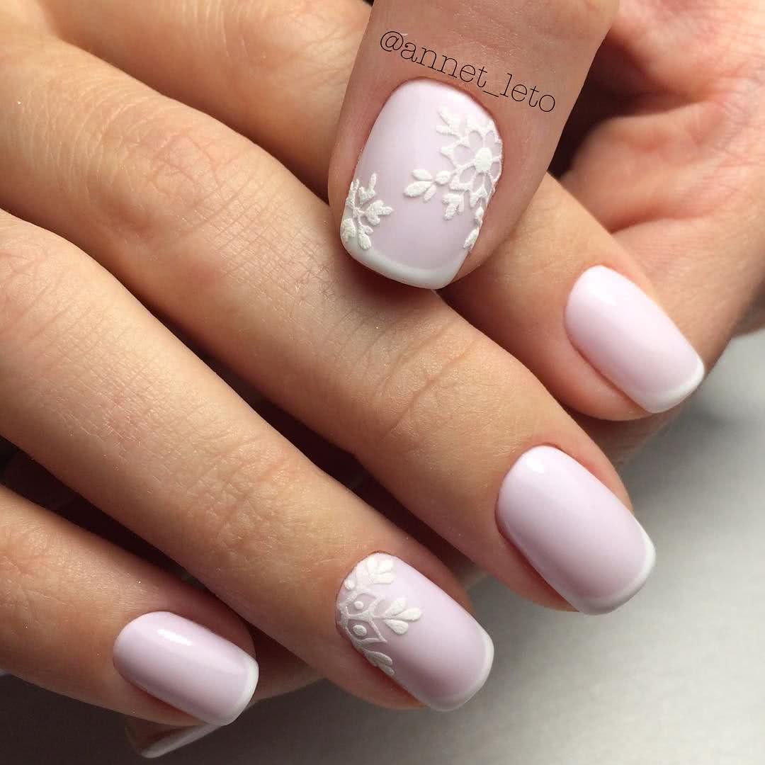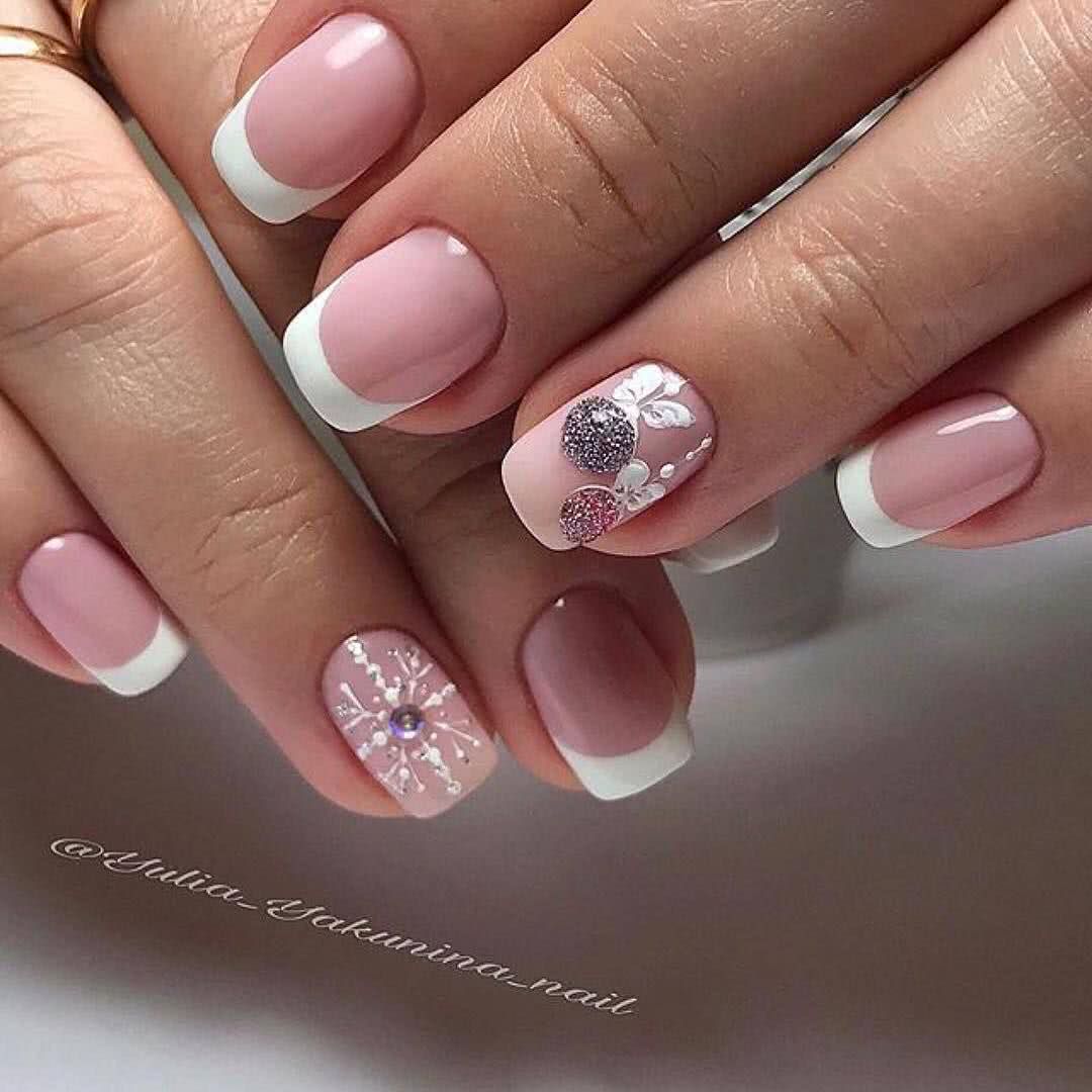 Но есть версии нежного маникюра: френч с кружевами из зимних узоров. При этом основа может быть, как нежно розовой, так и прозрачной. Или вовсе без основы. Эта версия полна изыска, ведь минимализм в тренде. Как выглядит этот маникюр 2020, фото: