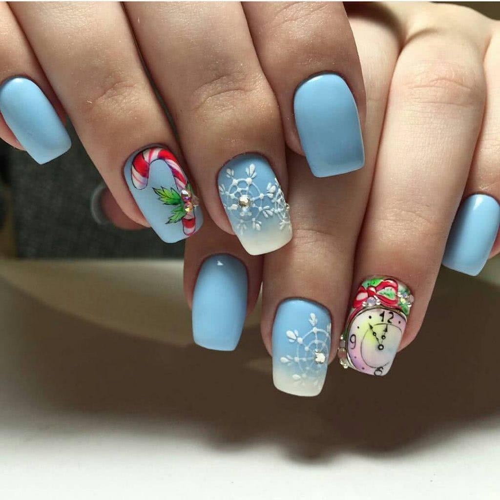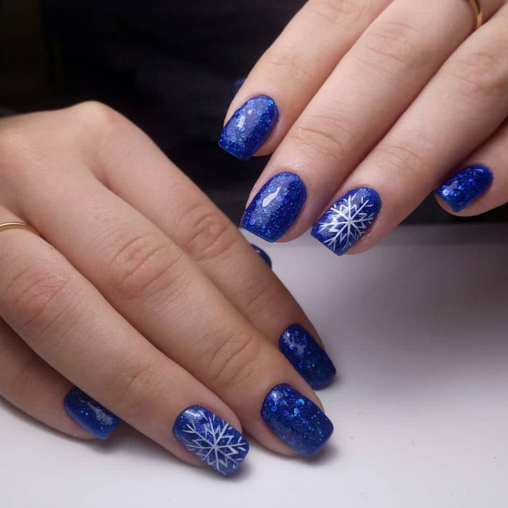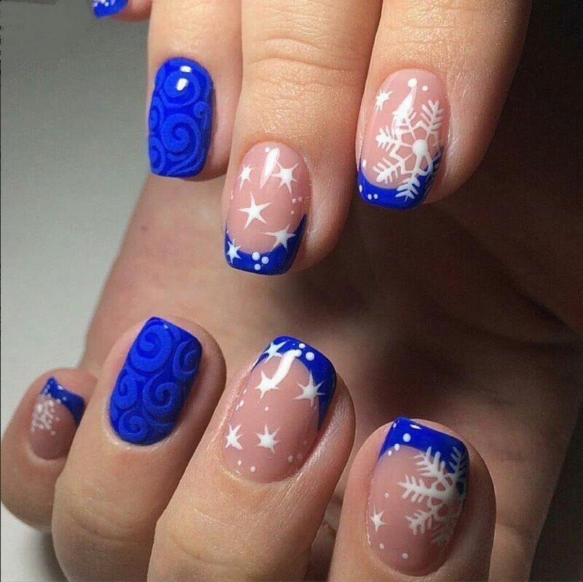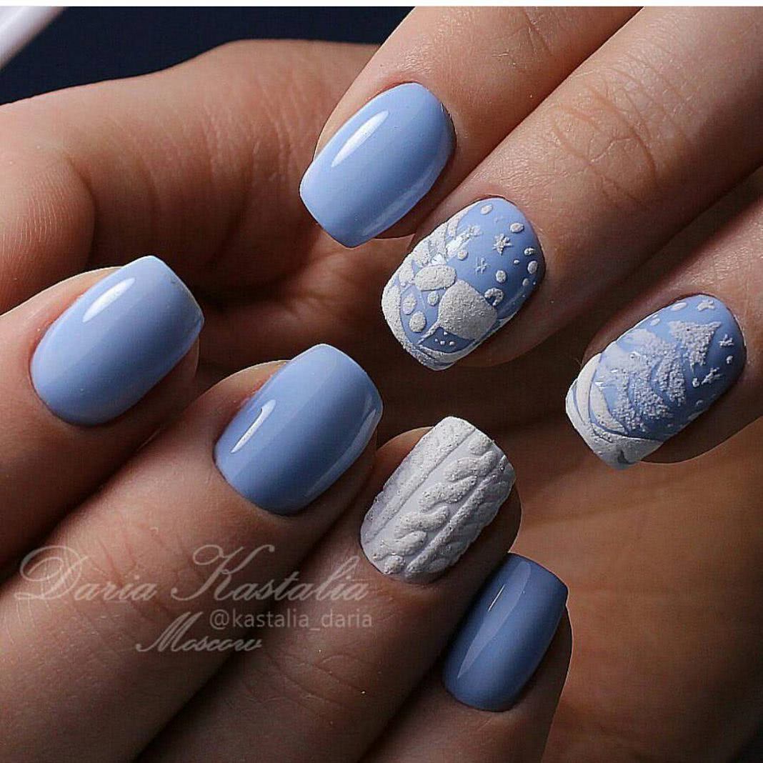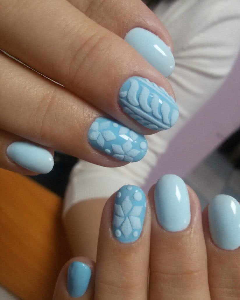 • сине-голубой глянцевый градиент со снежинками – куда же без него? Блестящее лакшерное омбре в двух самых ассоциативных цветах зимней поры (сине-голубой) будут дополнены дизайном с рисунком и белоснежными узорами в виде расписных снежинок. Также снежинки могут быть украшены различными элементами в виде декора со стразами, с клейкими заготовками, со штаммами и прочими разновидностями современного нейл-арта;• плетёная выкладка – песочная поверхность витиеватых кос наподобие свитерной вязки очень круто и уместно смотрится в зимнюю пору. Это великолепное решение пришло в текущем сезоне и в грядущем будет также востребовано и актуально в силу своей элегантности, выдержанной красоты и притягательного внешнего вида;• хрустальная парча – диковинное новшество современности, великолепным образом играющее на ногтях в глянцевом блеске верхнего слоя в качестве узорчастых вензельных выбоин на основном пигментированном полотне. В зимнюю пору особенно актуально использовать гармоничные тона в виде белоснежного, небесно-голубого, тёмно-синего, насыщенного изумрудного. Имитирующие хрустальные завитки гелевые прозрачные выкладки поверх основного тона очень напоминают морозные узоры на окнах и вполне соответствуют выбранной зимней тематике;