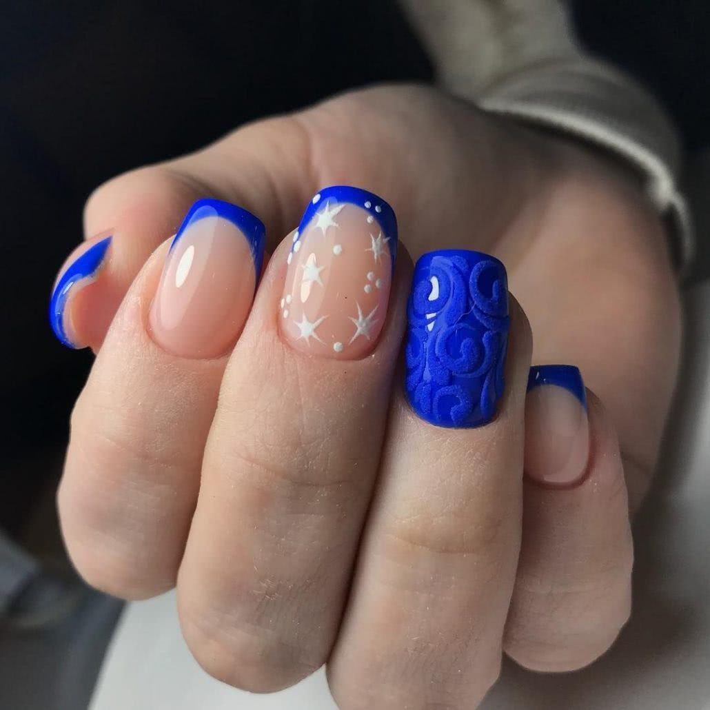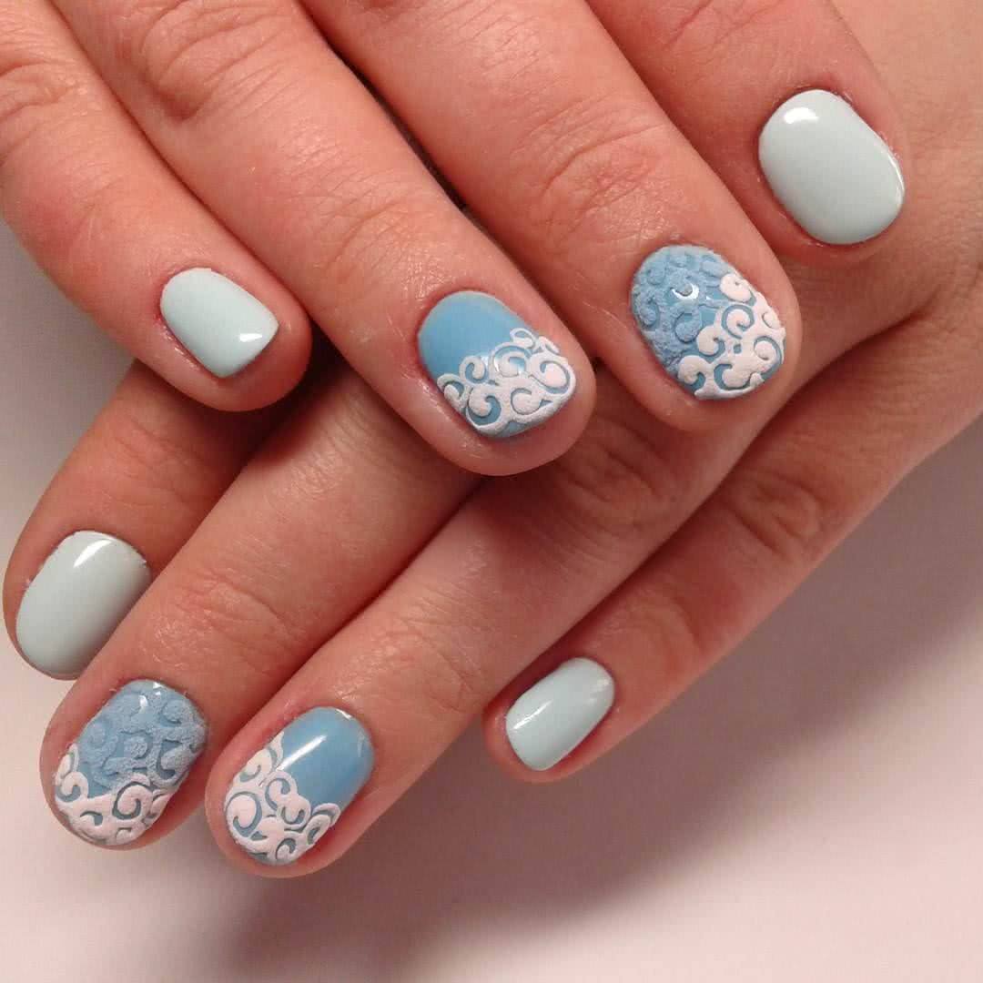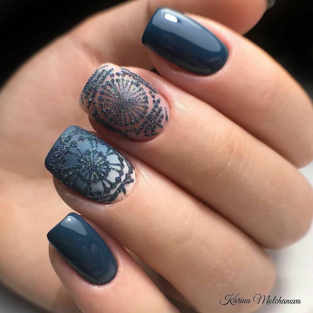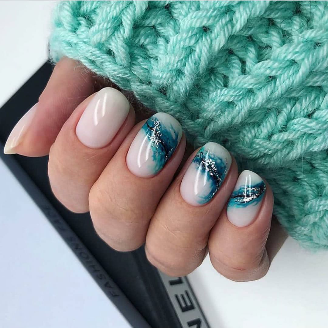 • сине-голубой глянцевый градиент со снежинками – куда же без него? Блестящее лакшерное омбре в двух самых ассоциативных цветах зимней поры (сине-голубой) будут дополнены дизайном с рисунком и белоснежными узорами в виде расписных снежинок. Также снежинки могут быть украшены различными элементами в виде декора со стразами, с клейкими заготовками, со штаммами и прочими разновидностями современного нейл-арта;• плетёная выкладка – песочная поверхность витиеватых кос наподобие свитерной вязки очень круто и уместно смотрится в зимнюю пору. Это великолепное решение пришло в текущем сезоне и в грядущем будет также востребовано и актуально в силу своей элегантности, выдержанной красоты и притягательного внешнего вида;• хрустальная парча – диковинное новшество современности, великолепным образом играющее на ногтях в глянцевом блеске верхнего слоя в качестве узорчастых вензельных выбоин на основном пигментированном полотне. В зимнюю пору особенно актуально использовать гармоничные тона в виде белоснежного, небесно-голубого, тёмно-синего, насыщенного изумрудного. Имитирующие хрустальные завитки гелевые прозрачные выкладки поверх основного тона очень напоминают морозные узоры на окнах и вполне соответствуют выбранной зимней тематике;
