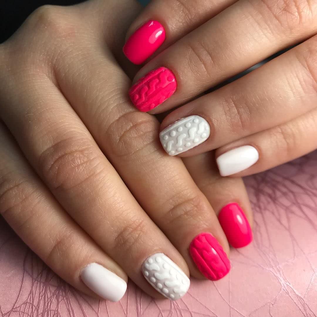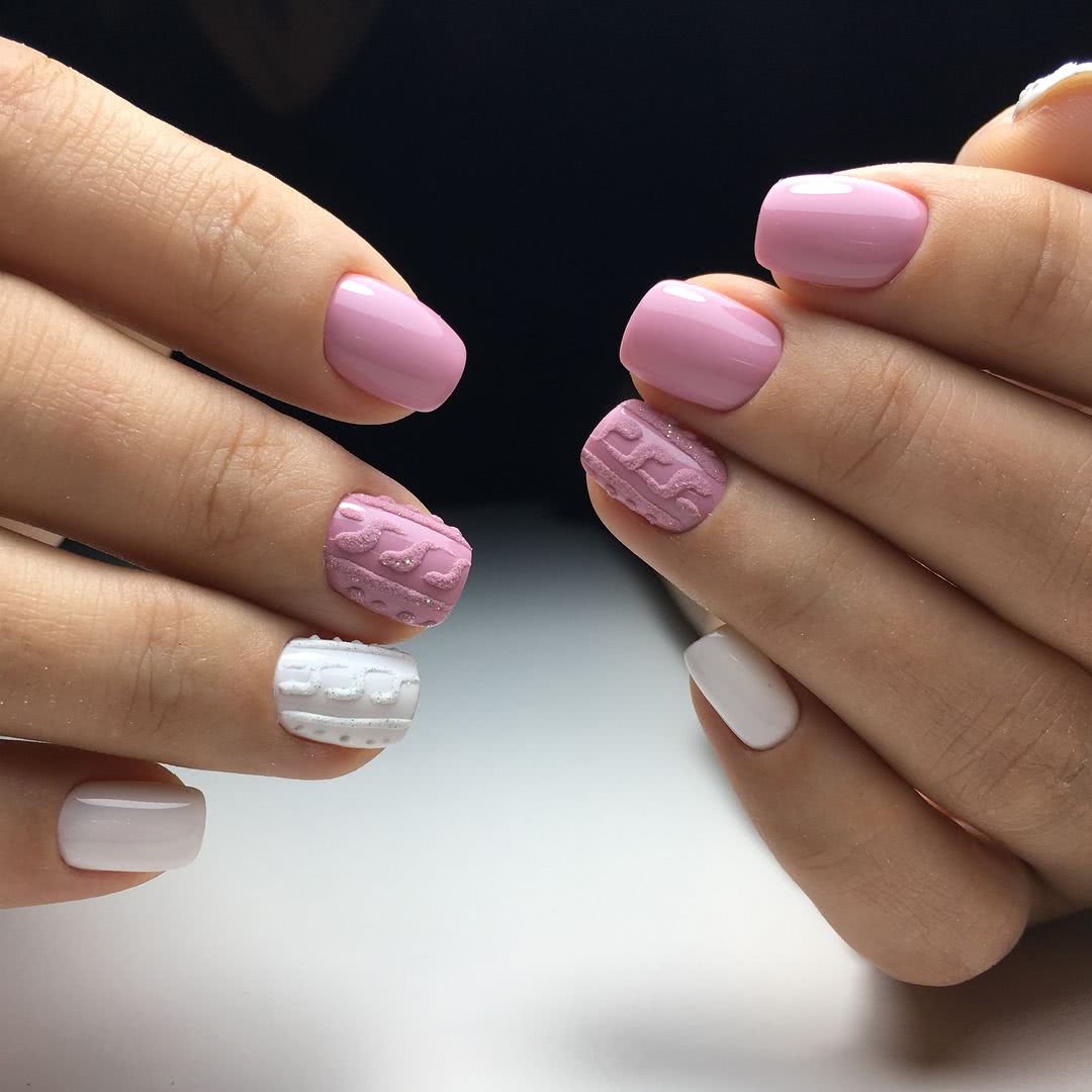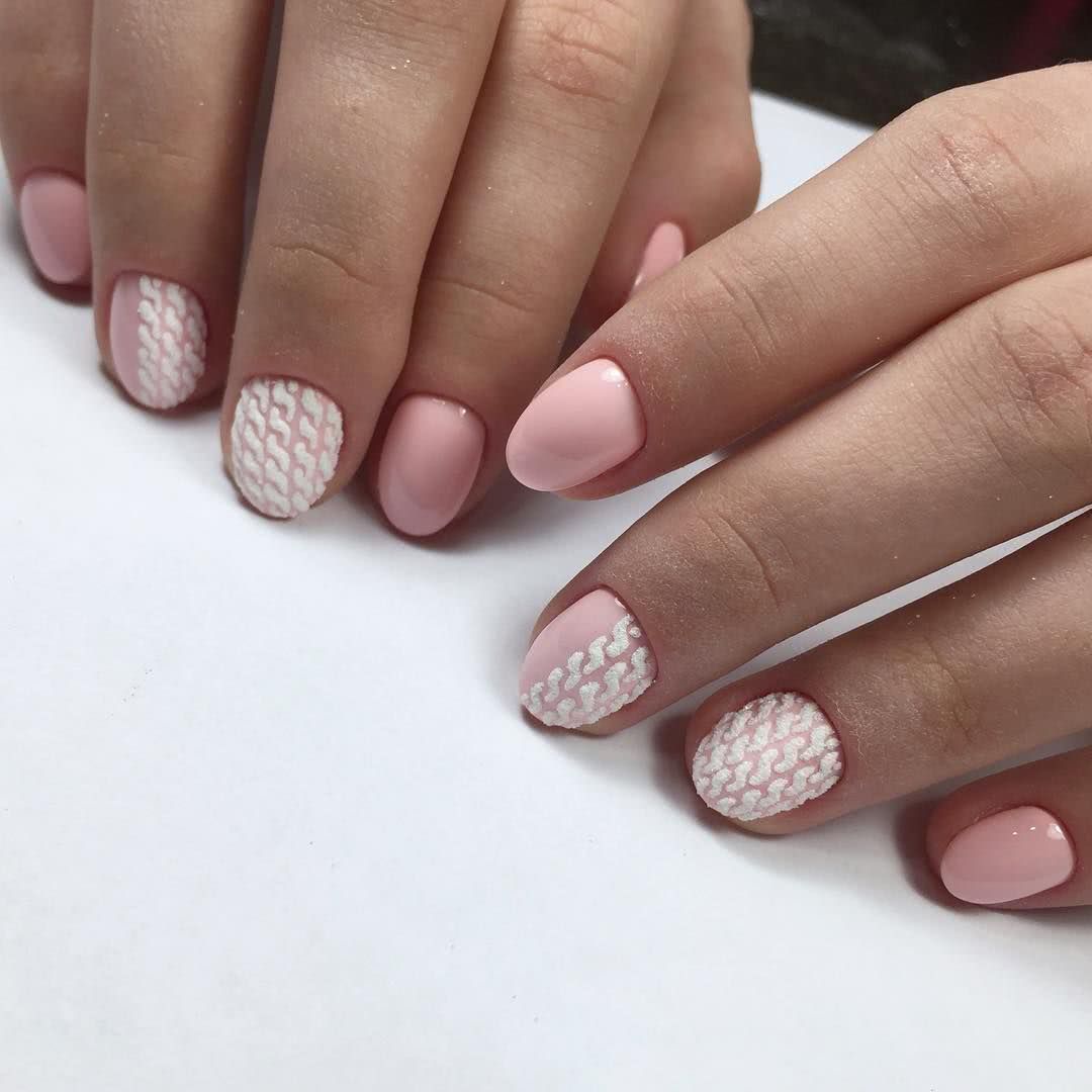 Эффект объемной вязки свитера очень красиво и изысканно смотрится на ногтевых пластинах любой формы и длины. Первые ощущения, с которыми ассоциируются такие узоры, — это тепло и уют, мягкий шарф, плед и кружка ароматного какао или кофе. Для создания вязаного дизайна используются в основном нежные или пастельные оттенки, хотя не менее интересно смотрятся темные и глубокие цвета. Основа под рисунок может быть матовой или глянцевой, все зависит от ваших предпочтений.