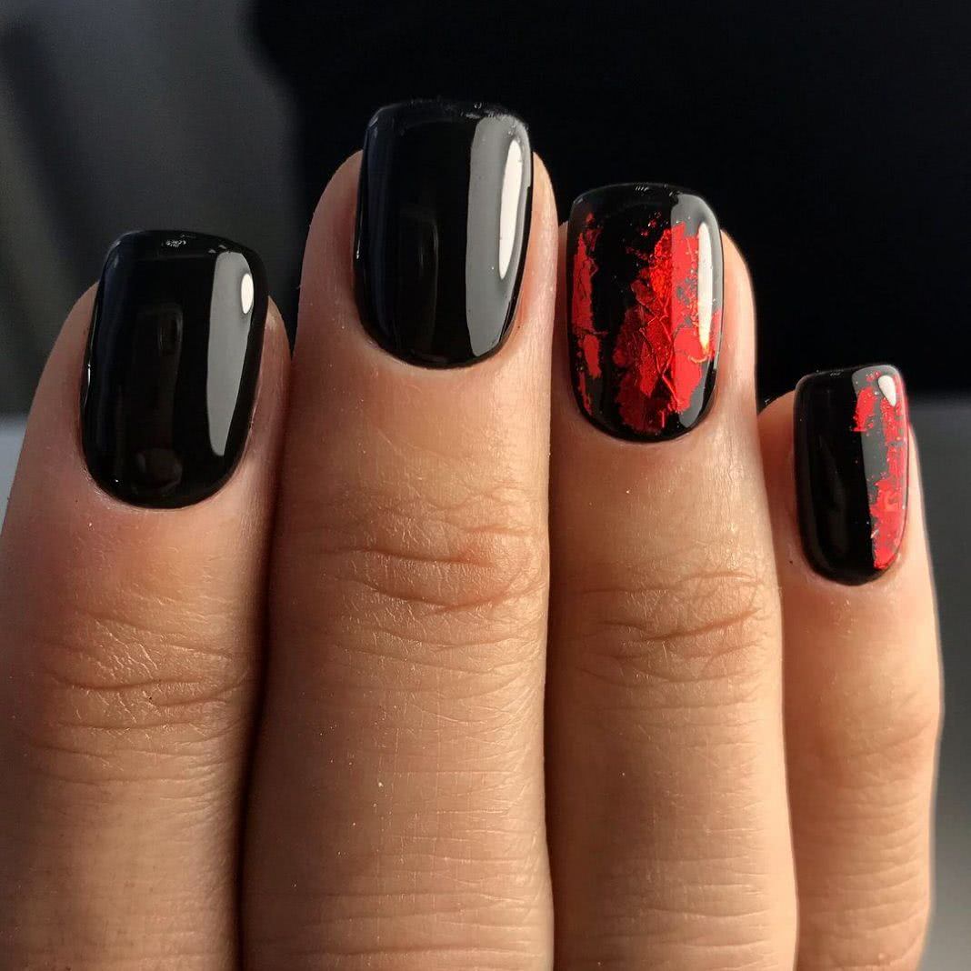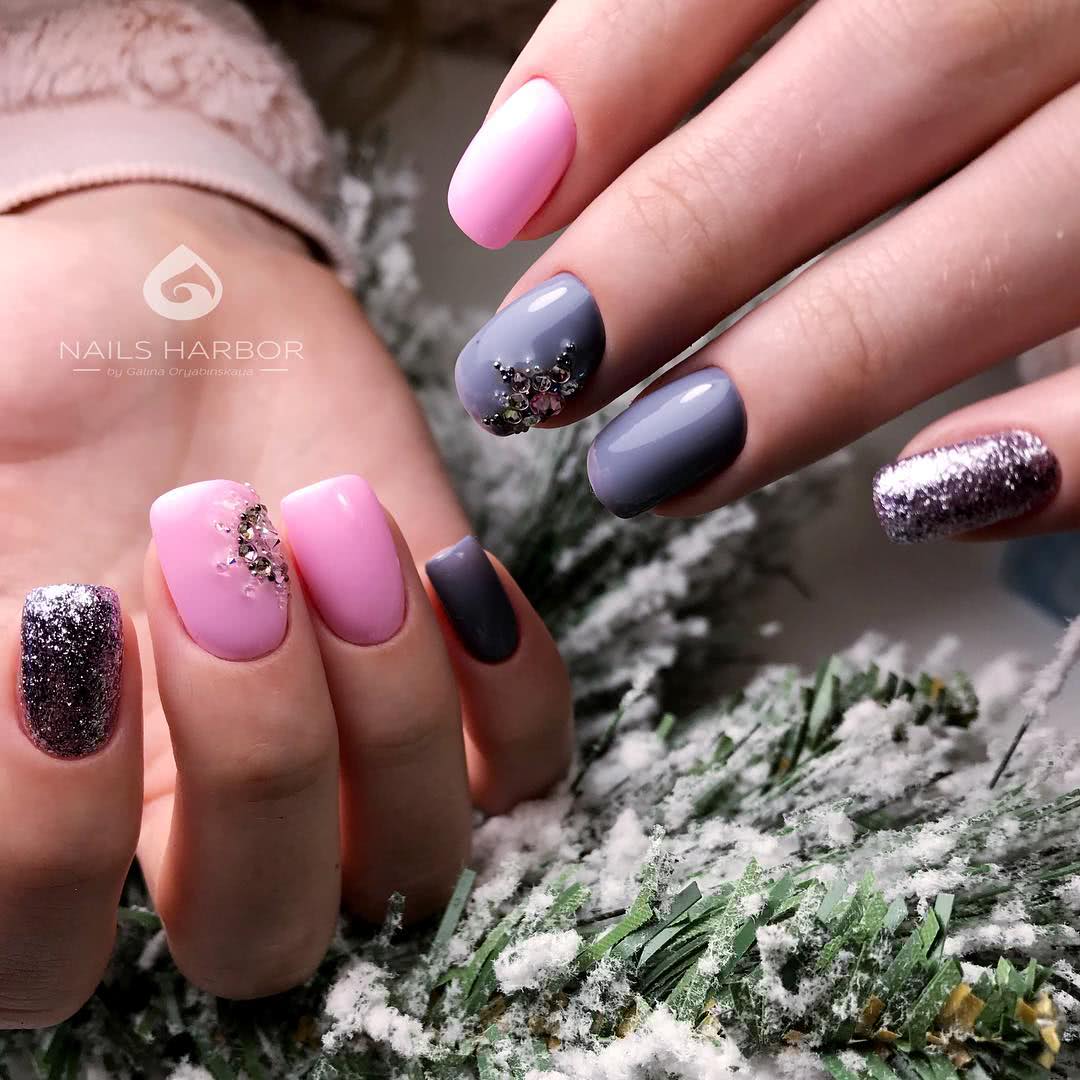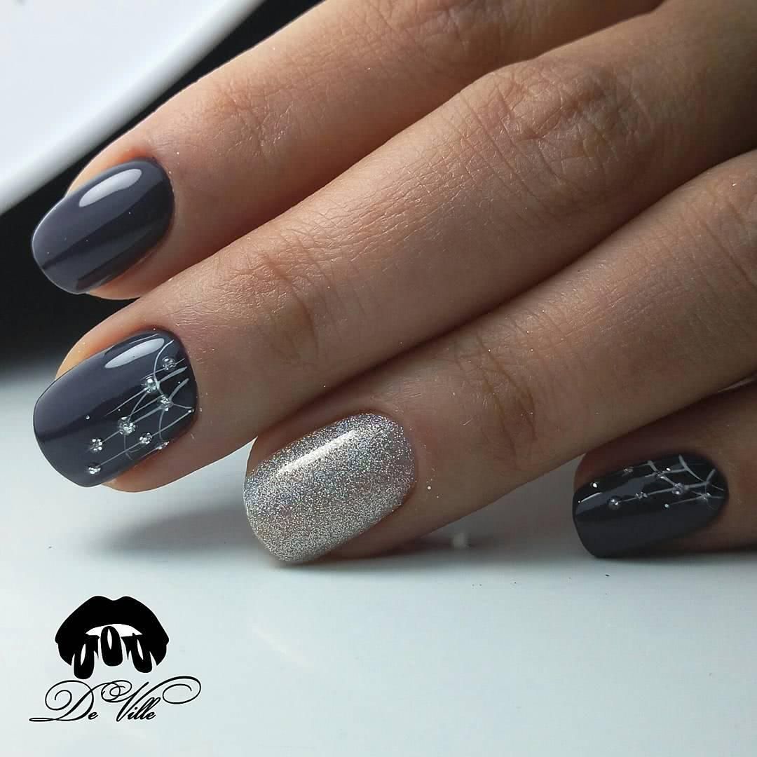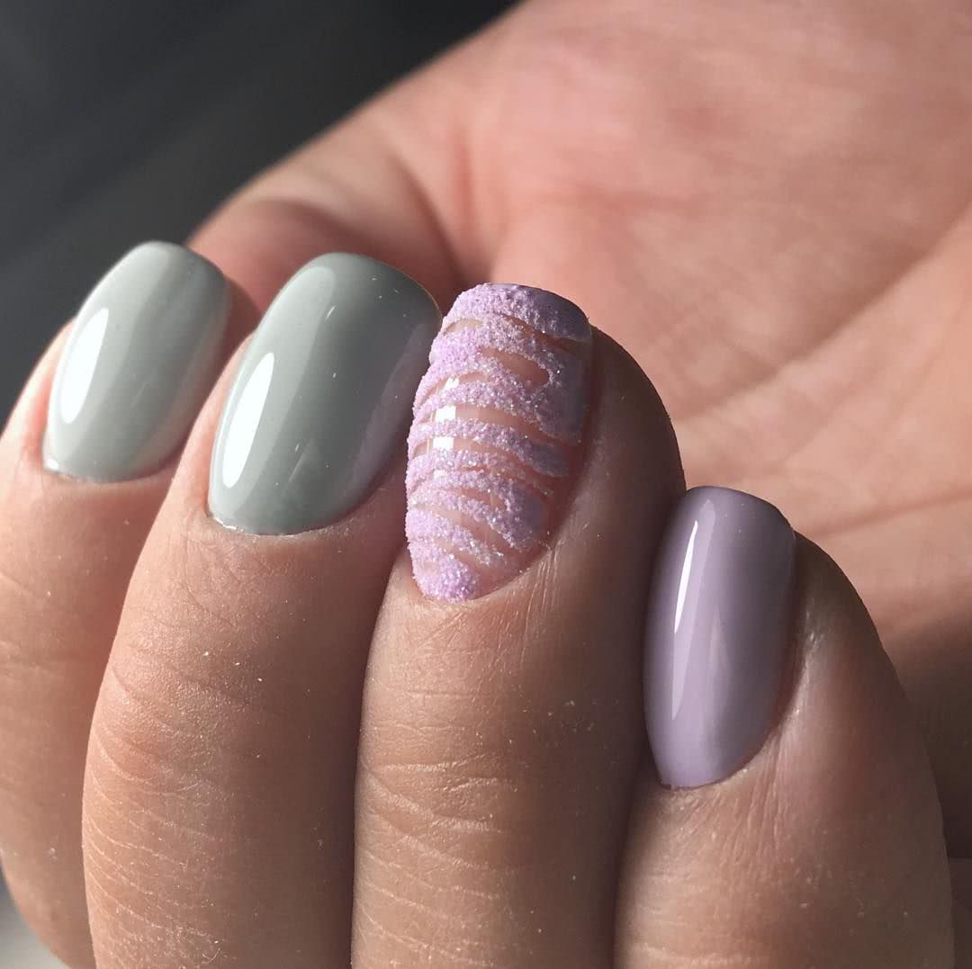 Важно отметить, что довольно актуально будет именно сочетание красного с золотом и марсала с золотистыми вкраплениями;• палитра серых тонов – от пыльного светло-серого до глубокого графитового цвета с переходом к мокрому асфальту будут в цене оттенки серого цвета во всей своей широте тонального выбора. Популяризируется матовая поверхность серой основы с выкладкой прозрачных капель в виде глянцевого геля поверх неё, будут уместны абстрактные геометрические пересечения с разрезом участков ноготков на тёмно-серые и светло-серые сектора, возобновится тенденция к эффекту битого стекла, в основе которого глубокий серый будет покрыт имитированными осколками серебристого стекла в виде фольги.