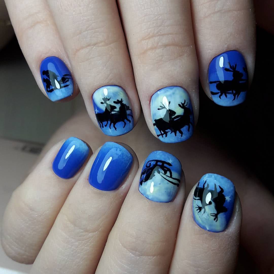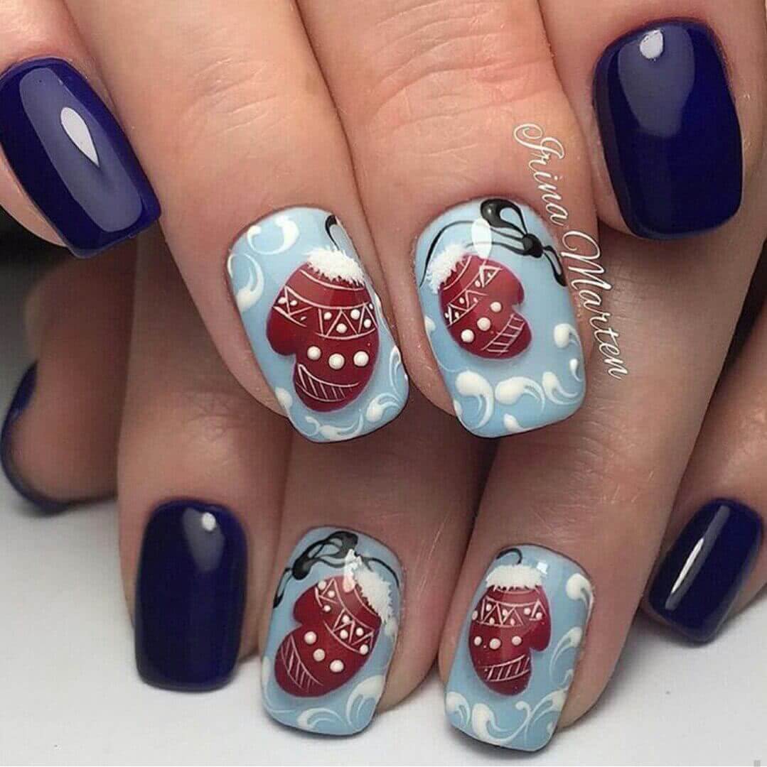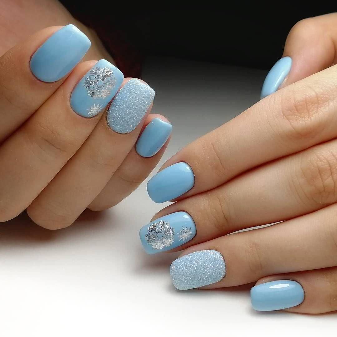 - голубой – легкий и универсальный цвет, который часто используется для выполнения зимнего тематического маникюра с елочками, снежинками, варежками, мишками Тедди