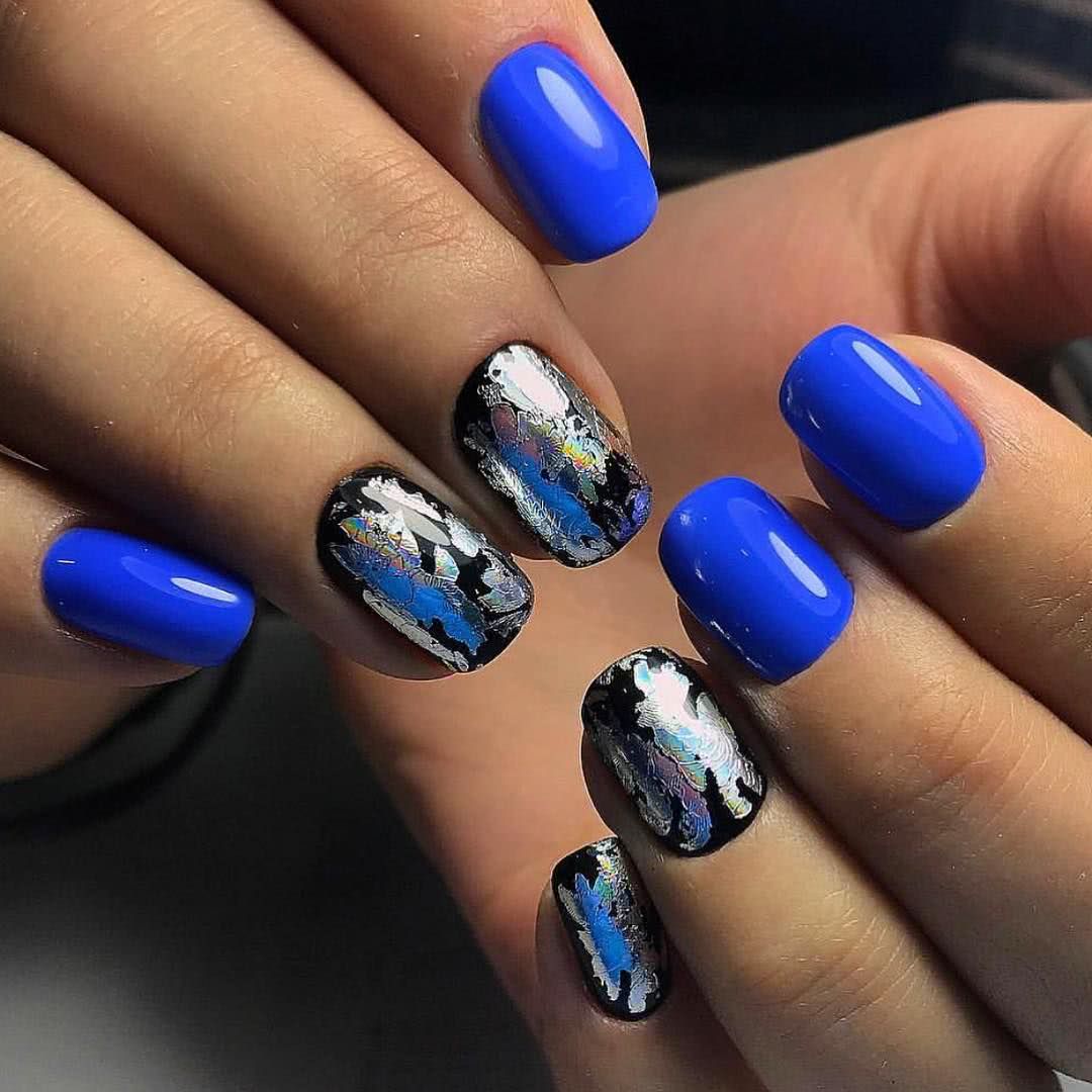 Дизайн с фольгой идеально подойдет для потрясающих вариантов зимнего маникюра. В сезоне 2020-2021 отдавайте предпочтение не только топовым вариантам фольги — золотой и серебристой, выбирайте также разноцветную, она шикарно смотрится с пастельными цветами лаков.