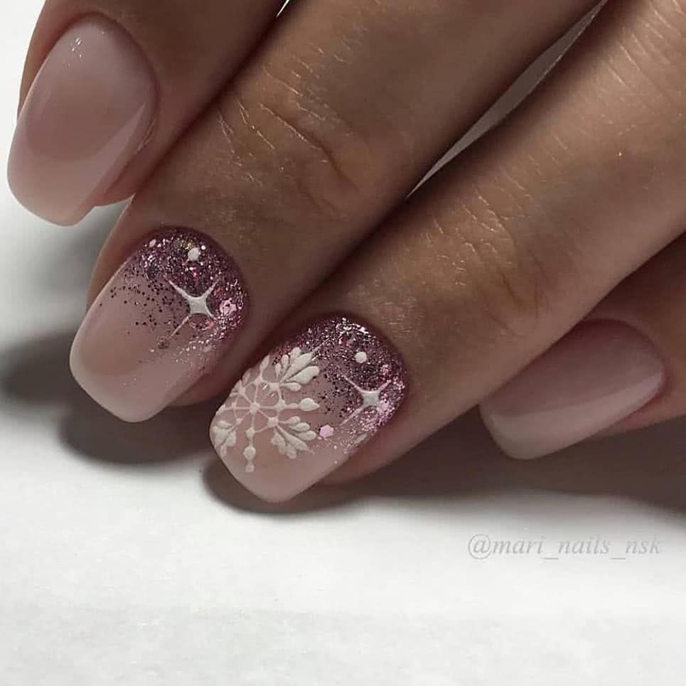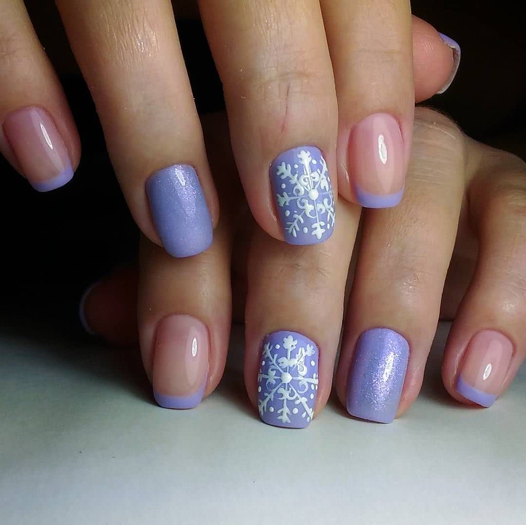 Для офисного варианта подойдет нюдовый маникюр, а также градиентный зимний дизайн ногтей. При этом снежинки не должны сильно выделяться. Лучше украсить ими какой-то один пальчик или сделать аккуратные тонкие линии по всем ноготкам.