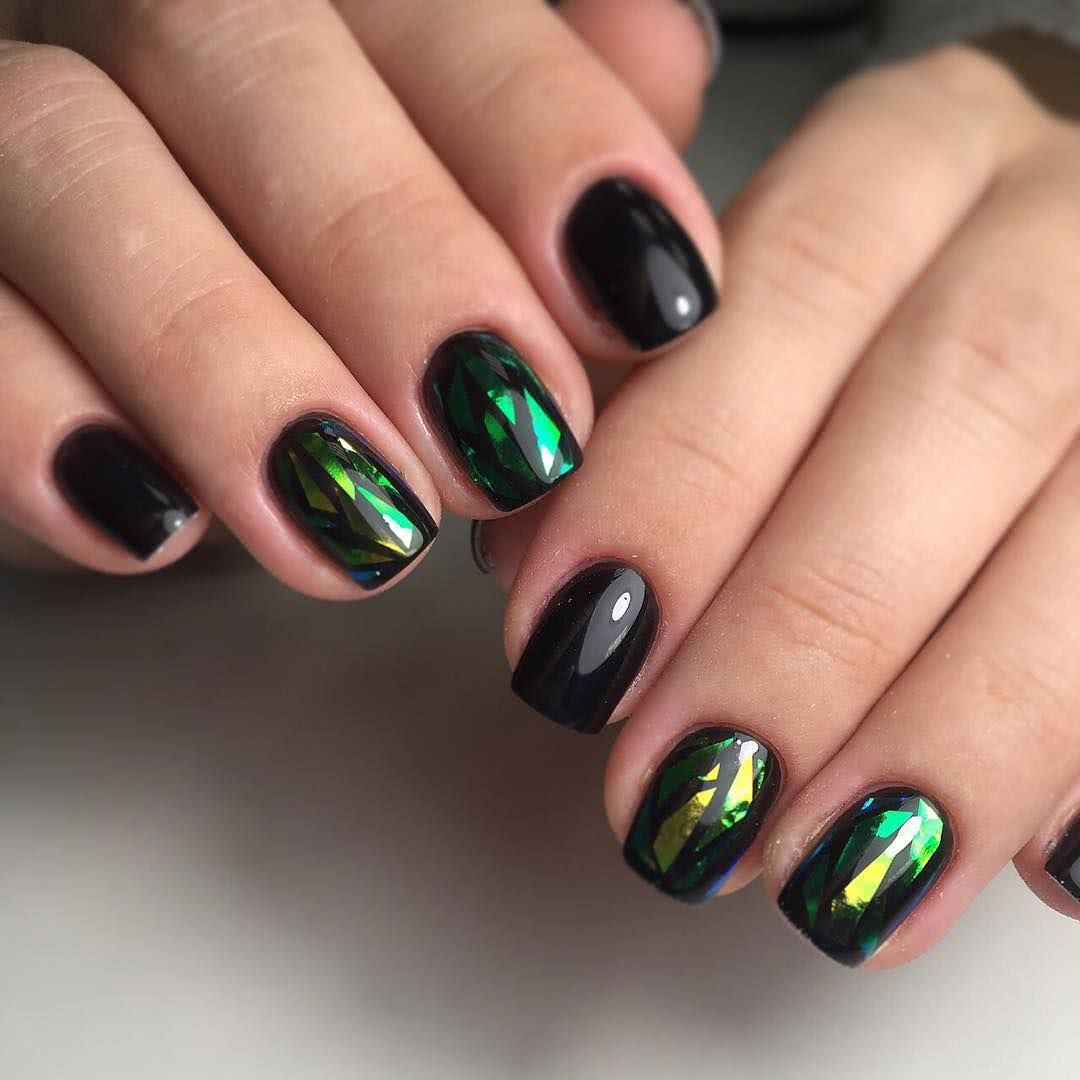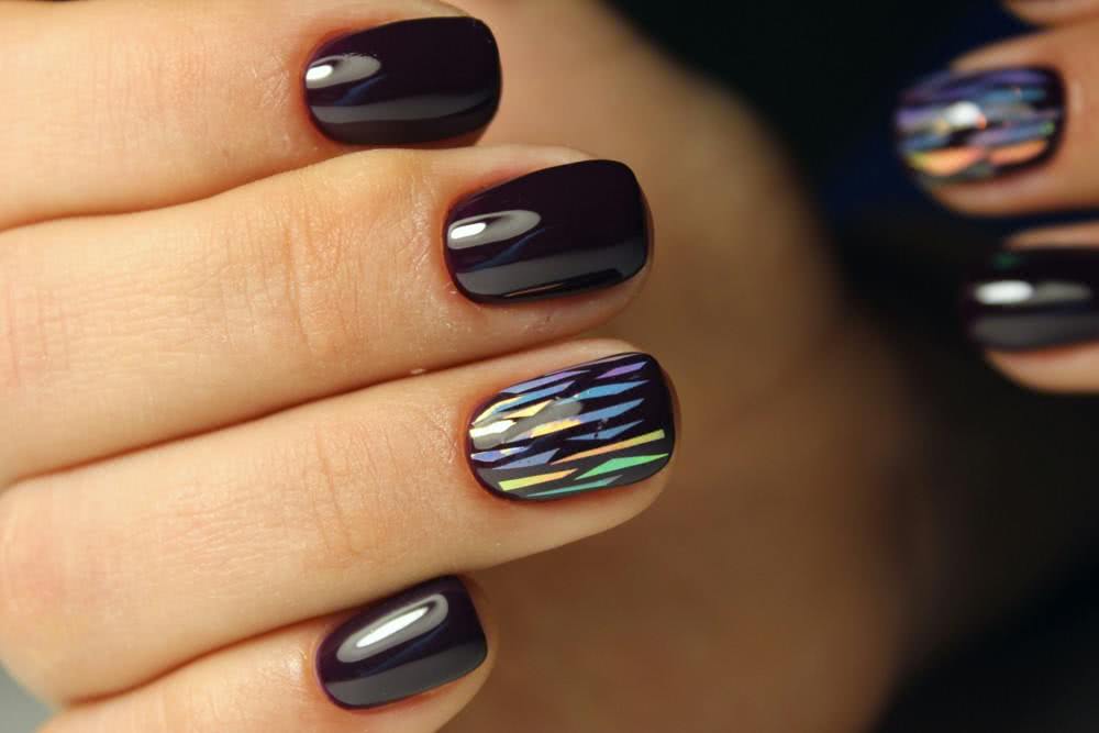 Отлично будет смотреться зимний маникюр в технике битого стекла. При этом желательно использовать в дизайне светлые оттенки, поскольку именно они больше будут походить на эффект расколотого стекла. Чтобы такой маникюр отличался высоким статусом, предпочтительней дозировать декор и выполнять его только на двух ногтях из десяти. Для темных лаков можно подобрать голографическую пленку — она внесет нужный настрой для торжественного маникюра.