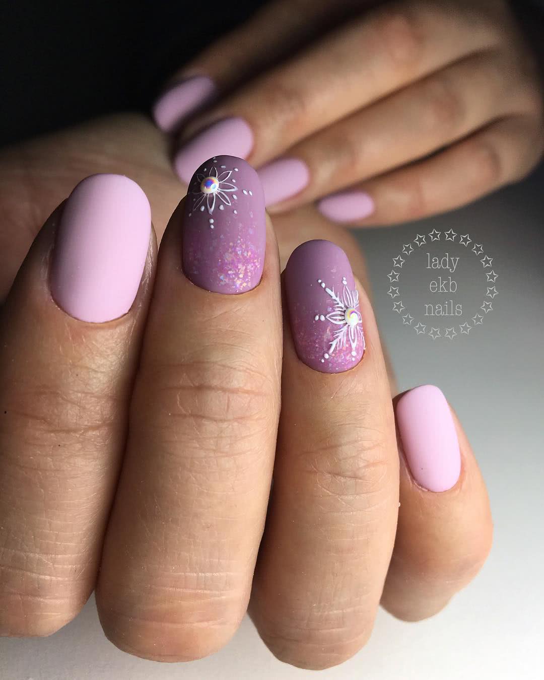 Матовый маникюр очень красиво передает глубину цвета лака и на нем шикарно смотрится любой дизайн. Для зимнего матового маникюра можно использовать темные насыщенные оттенки: черный, бордовый, фиолетовый смотрится очень эффектно, но при этом и нюдовые пастельные цвета тоже будут актуальными в 2020-2021 году.