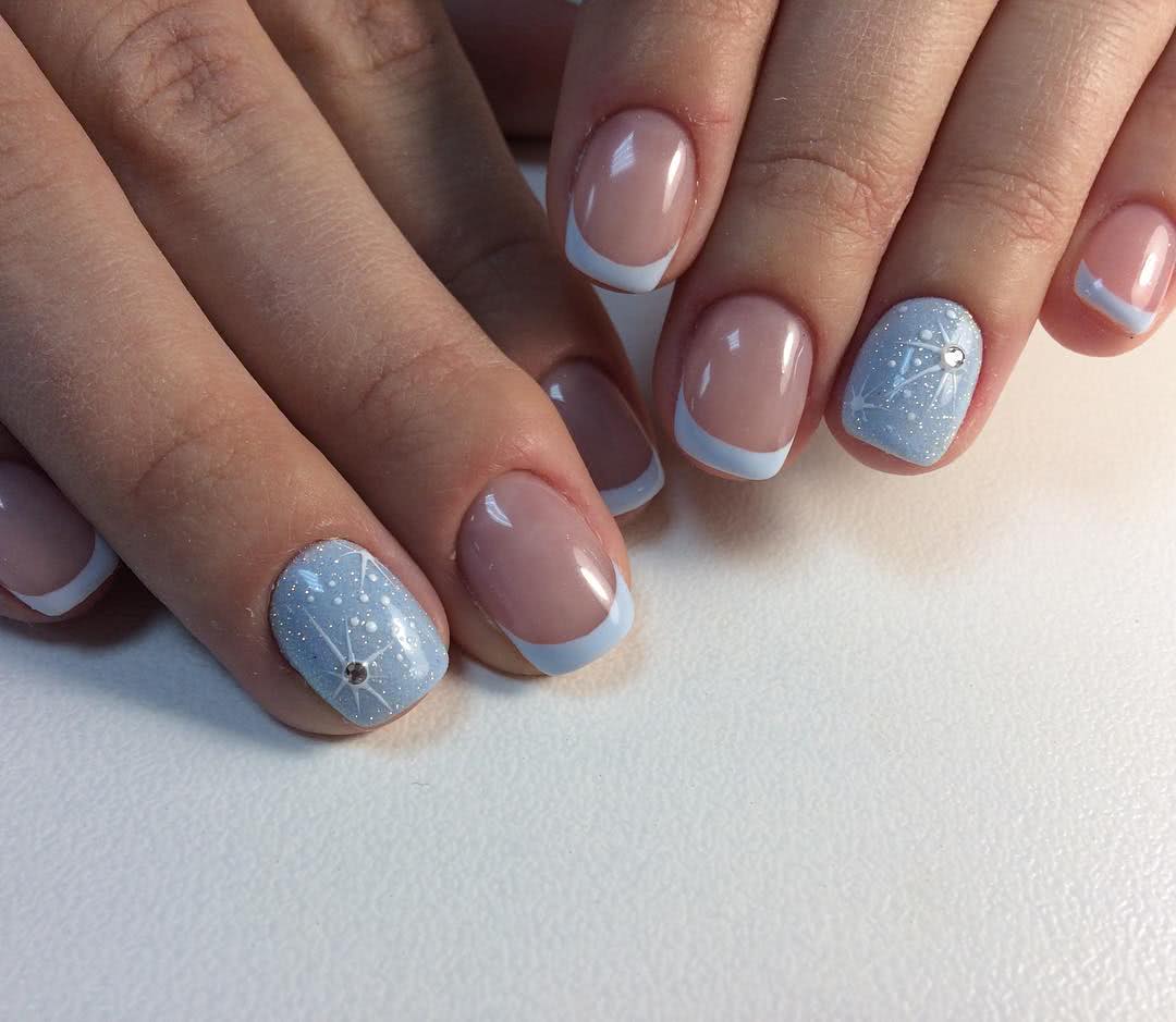 Одним из легких решений для зимы станет французский маникюр. Он может быть как традиционным телесным, так и выполненным в различных цветовых сочетаниях. Дизайн на акцентных ногтях френча можно выполнять по окрашенной основе, а также используя прием негативного пространства. Например, покрыв прозрачный лак легкой вуалью, а затем выполнив на основе с легким перламутром кружевной дизайн в виде морозных узоров, можно создать эффект хрусталя или заснеженности.