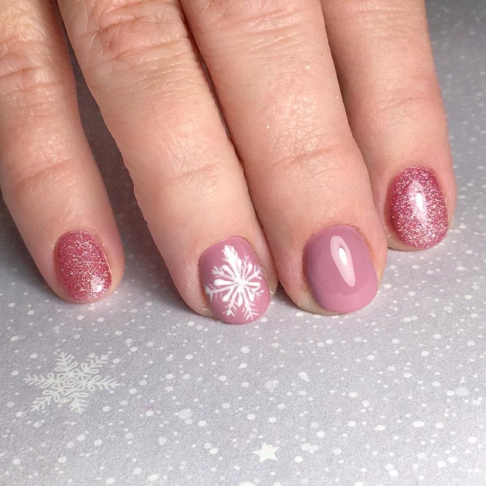 Зимний пудровый маникюр напоминает новогоднюю игрушку. Для него используют флок пудру. Фантазия здесь безгранична в выборе сочетаний вариантов. Обычно выбирают в тон пудры обычный лак и наносят определённый рисунок, или выделяют несколько пальцев, покрывая полностью составом ногтевую пластину, остальные оформляют с использованием гелевого покрытия в тон. Зимний кружевной дизайн создают с глиттером, для передачи сверкающего снежного наста под лучами зимнего солнца.