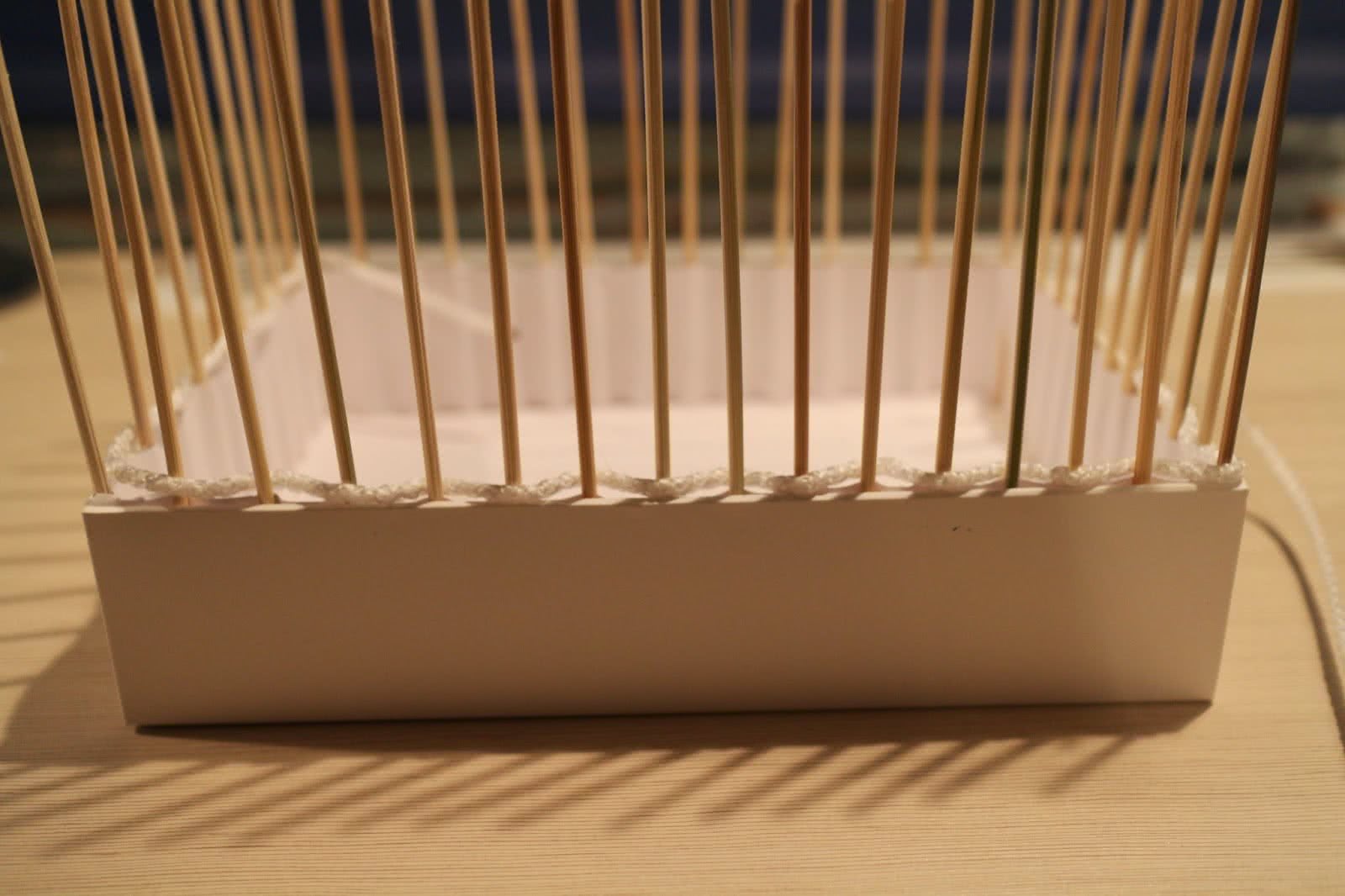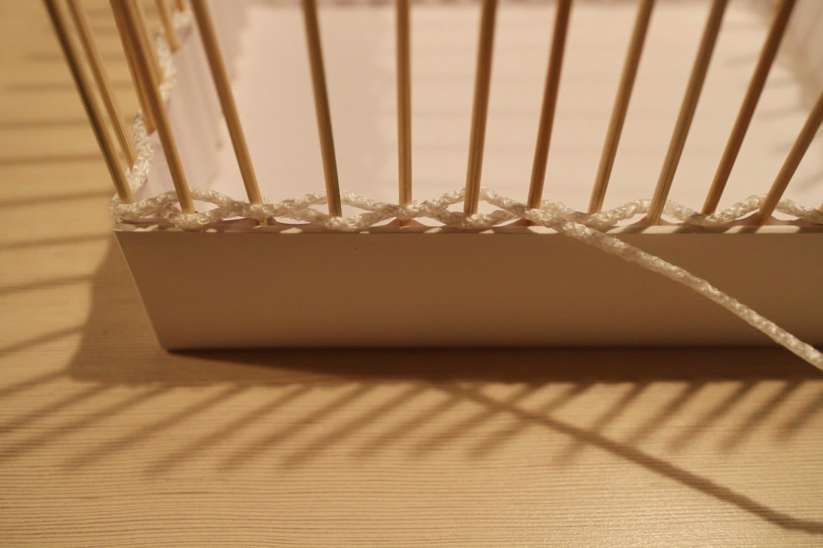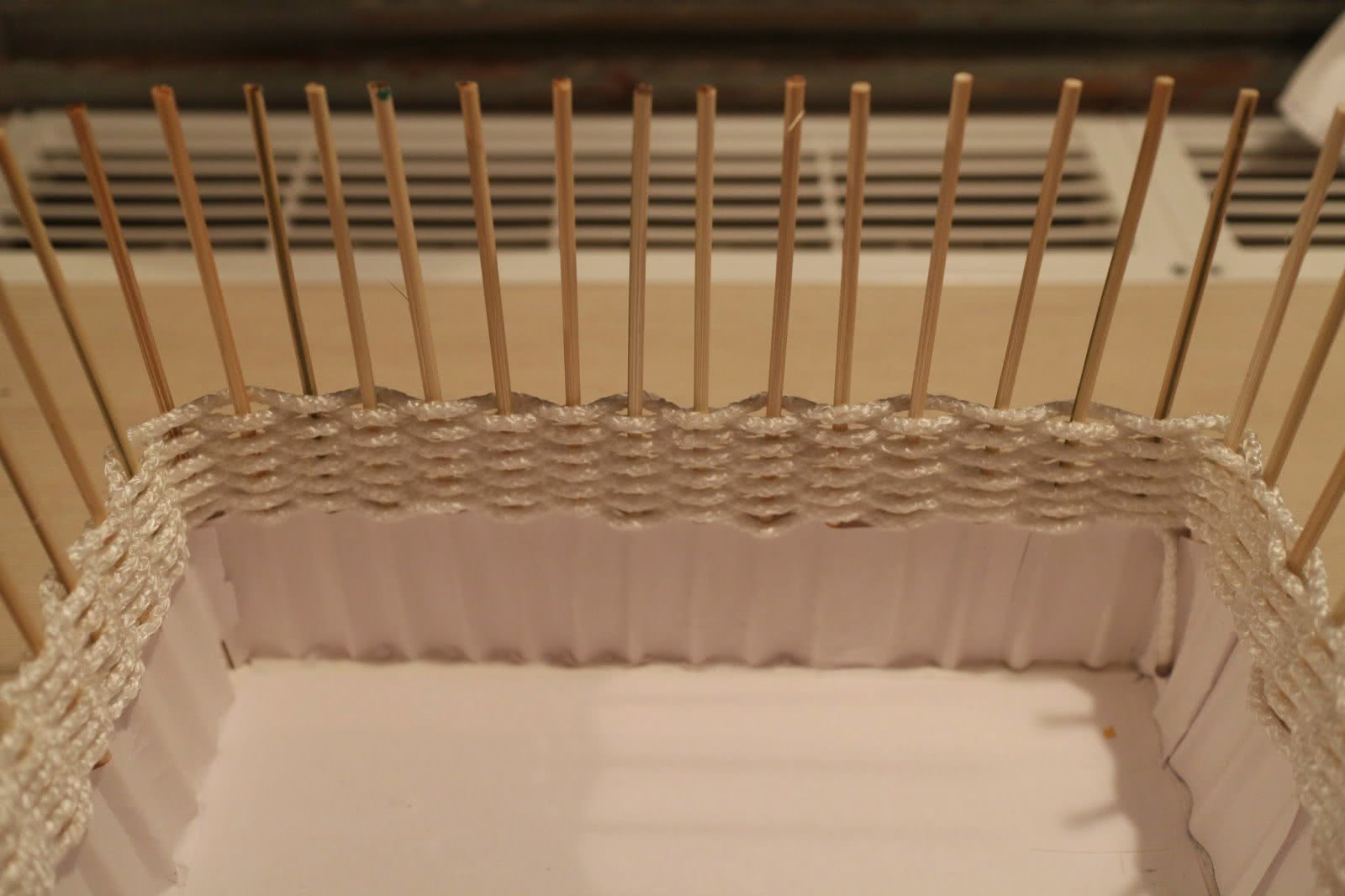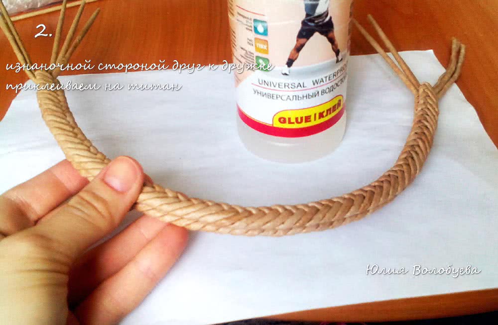 - Вплетаем лозу между вертикальными заготовками, хорошо прижимая трубочки друг к другу.