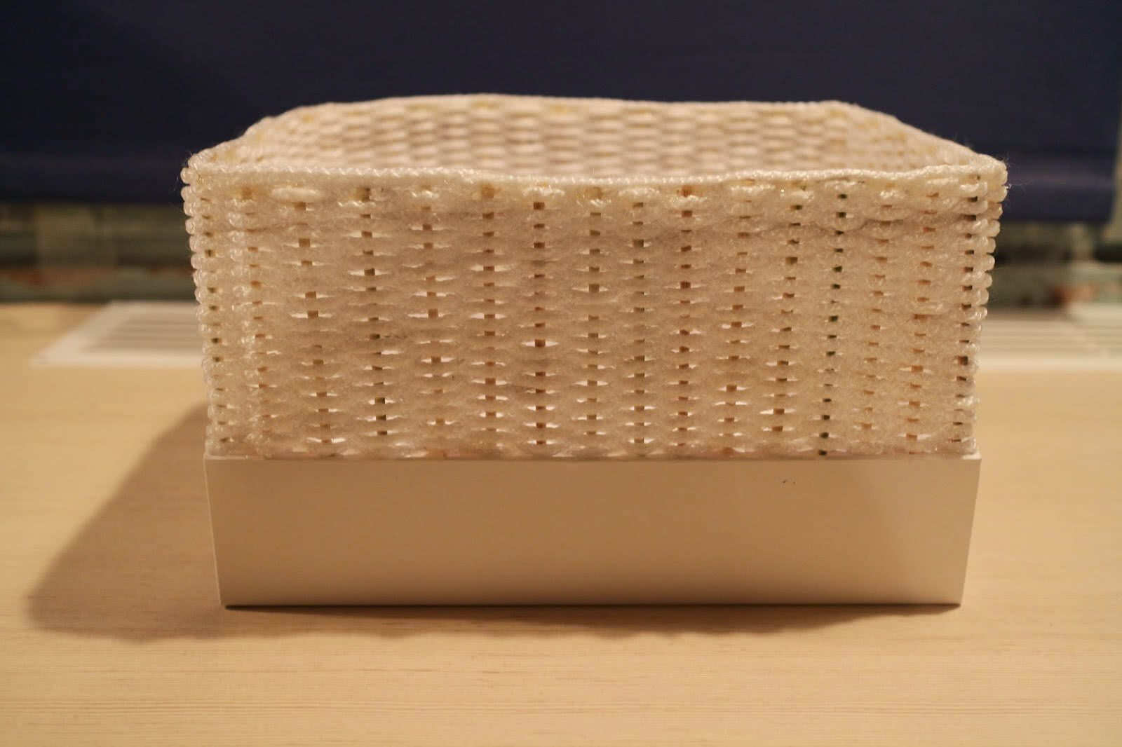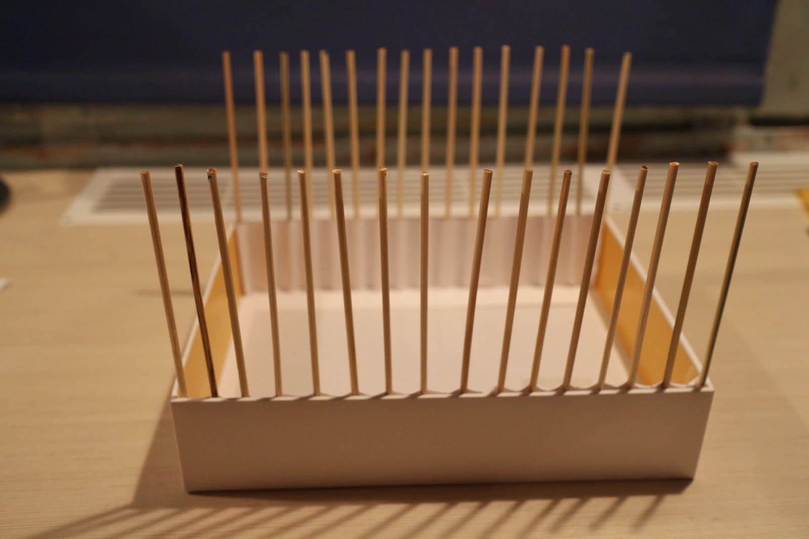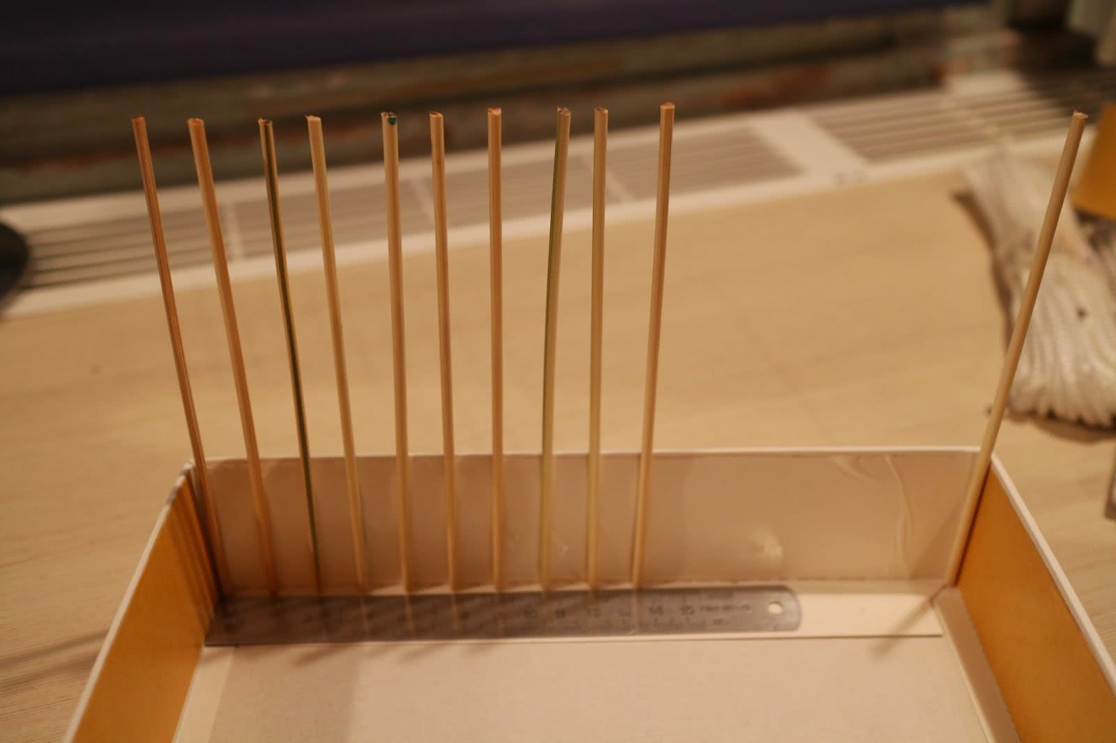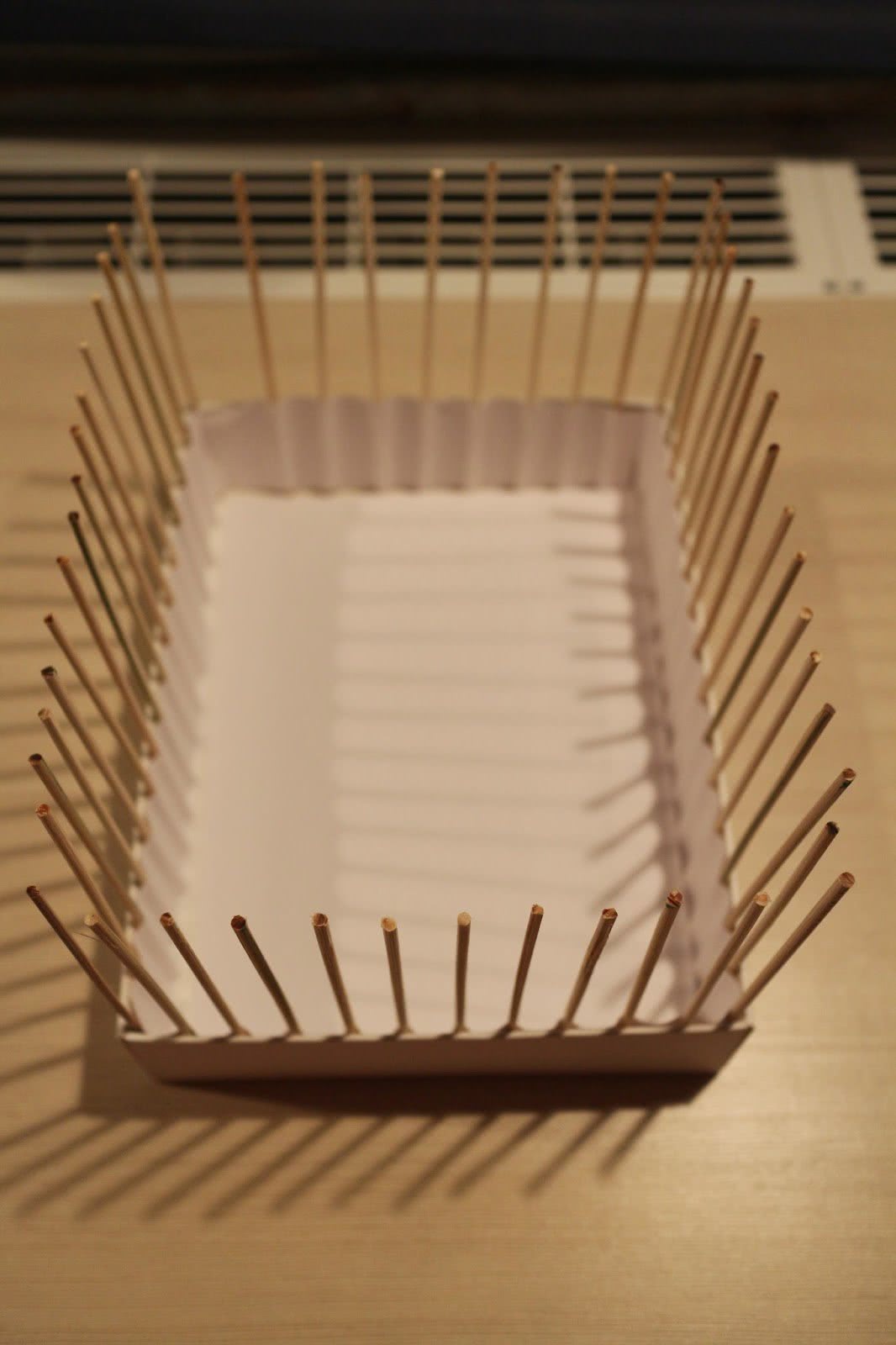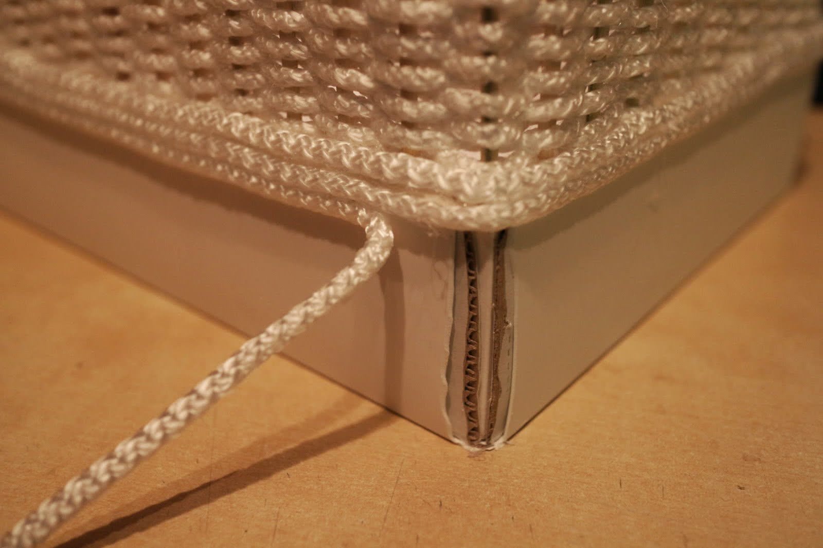 - На дно подготовленной картонной коробки приклеиваем концы получившихся газетных трубочек. Углы коробки пока не трогаем.