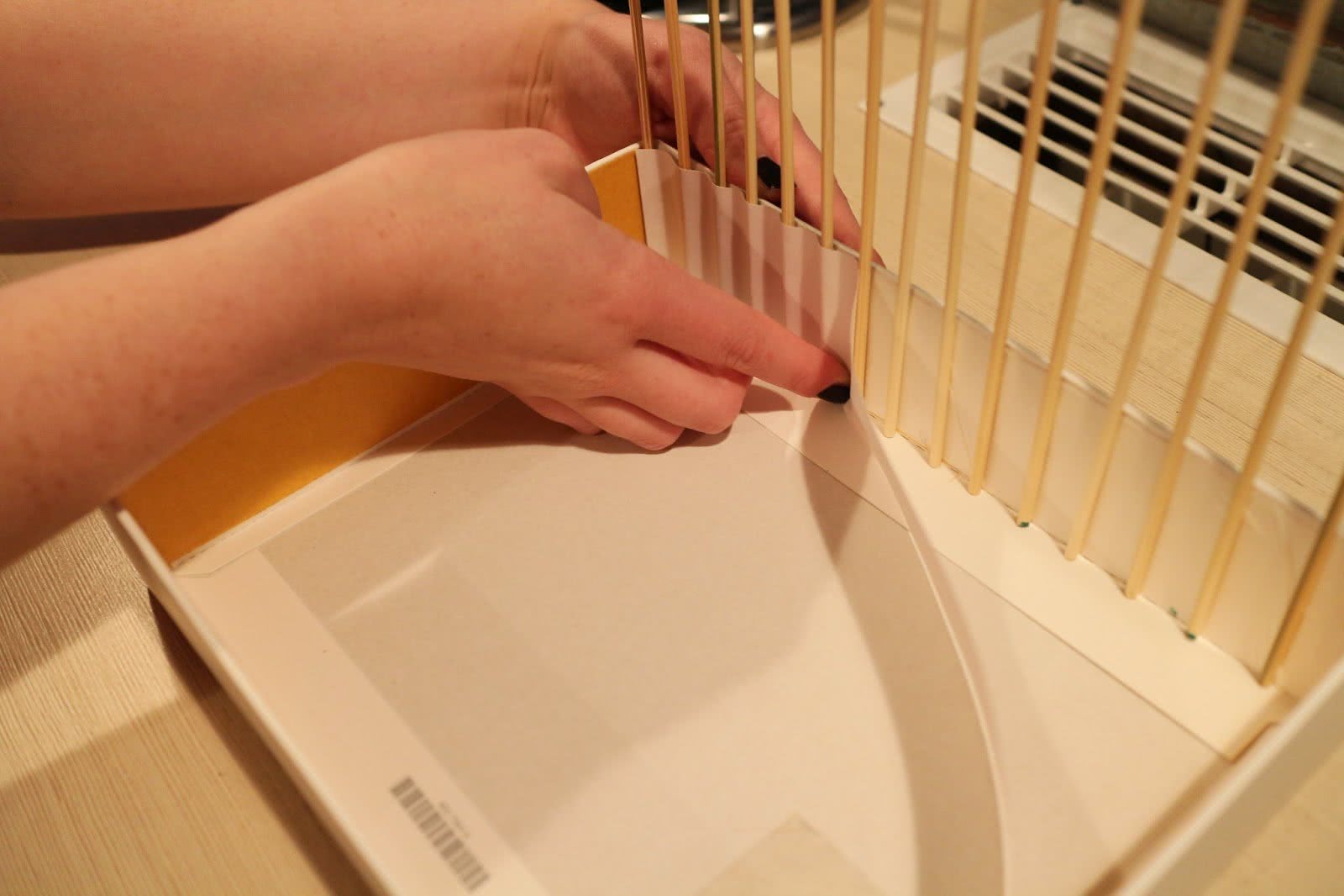 - На дно коробки приклеиваем плотный картон, прижимаем его чем-нибудь тяжёлым и даём высохнуть.