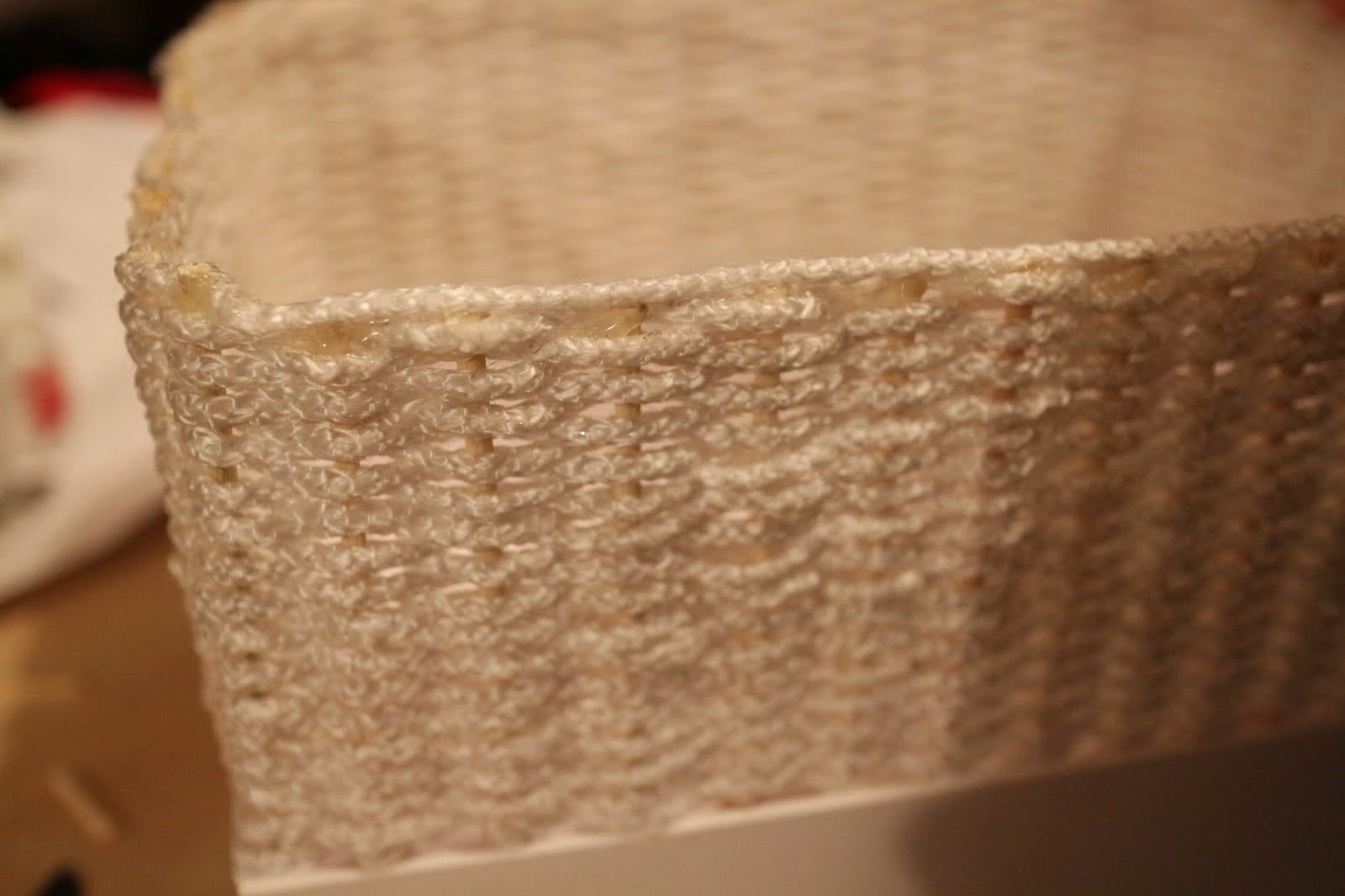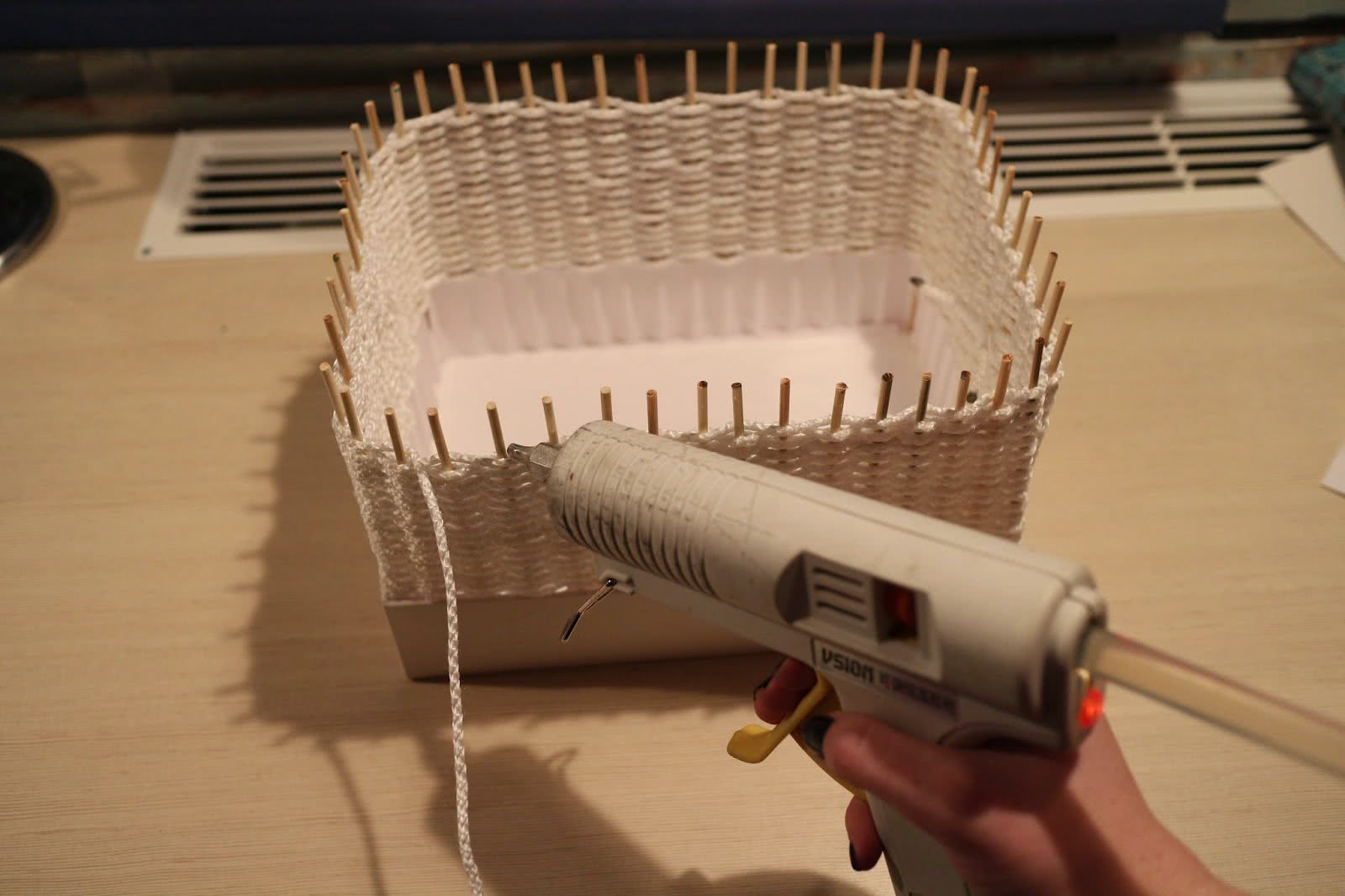 В конце сделать ручку для корзины. Для этого намазать полоску клея от одной стороны будущей корзинки до другой. Обмотать пряжей в несколько слоев.