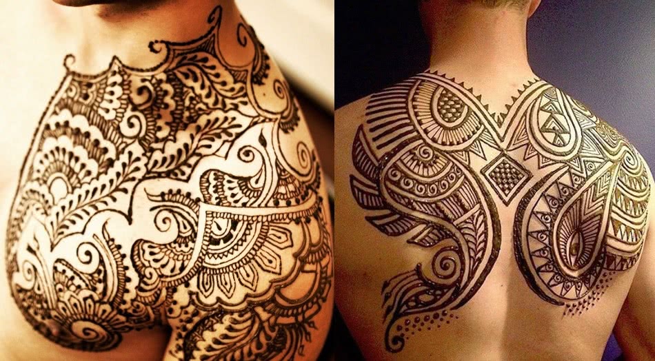 Мехенди на мужских плечах смотрится также достойно, как и обыкновенное тату.