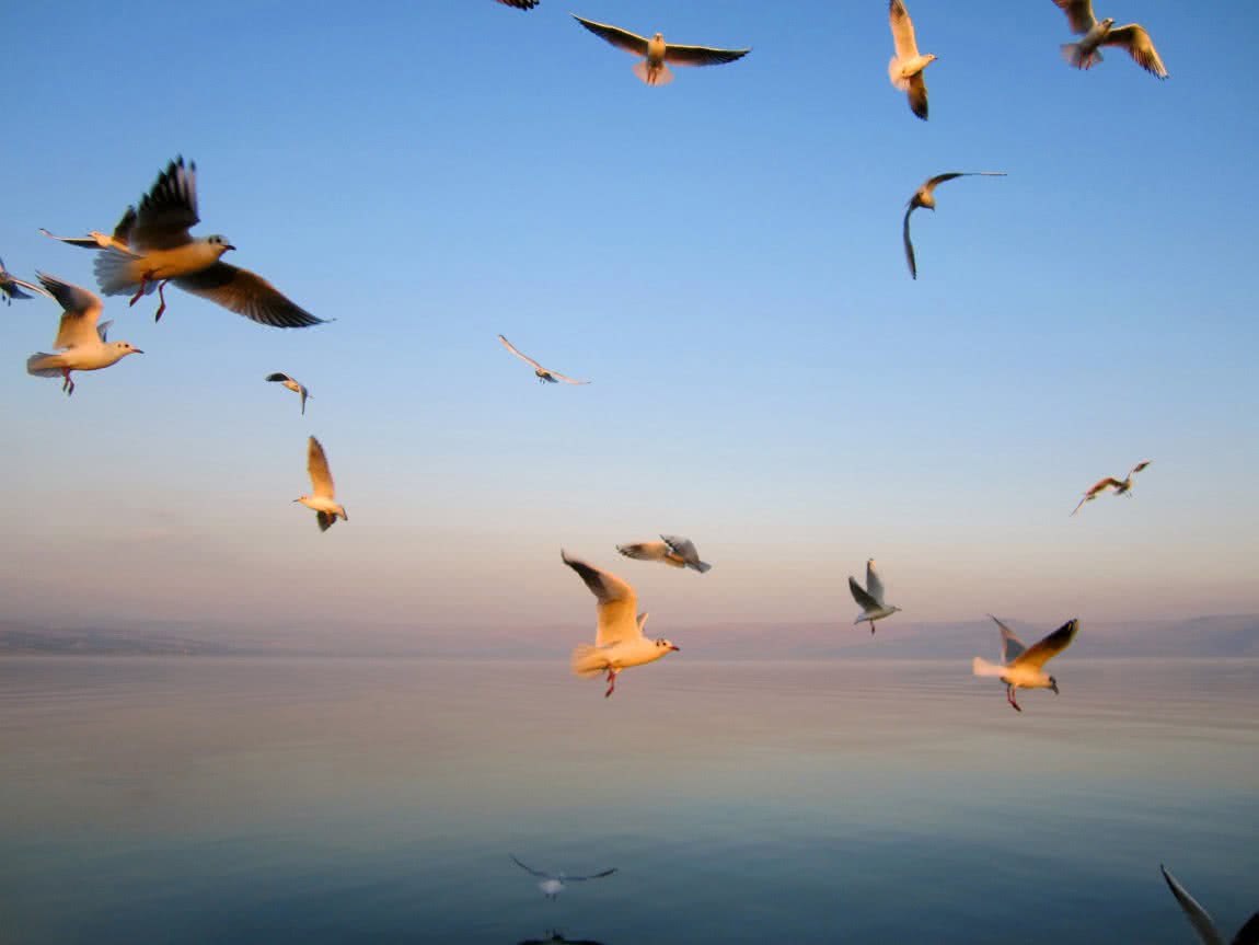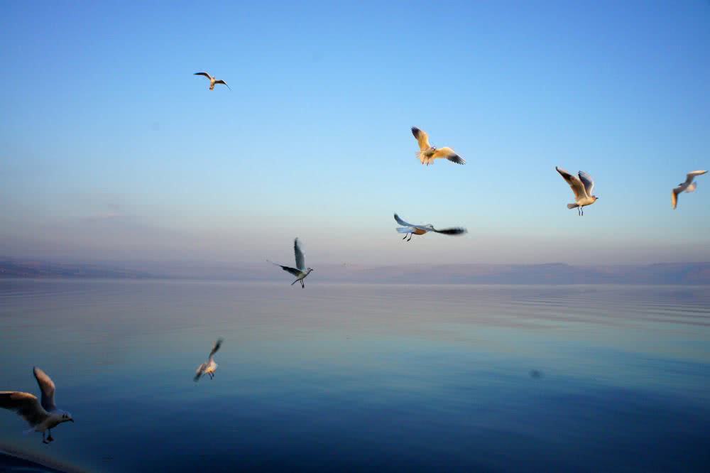 Стоит первозданная тишина. Лишь чайки парят над водой в надежде на корм. Они настолько близко, что можно было прикоснуться их крыла. Ветра на Галилейском озере почти нет. Вода тихая и спокойная.