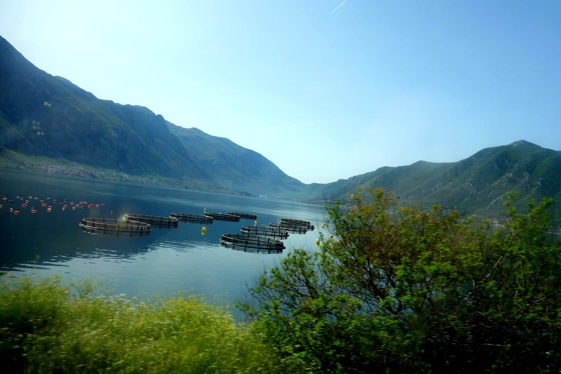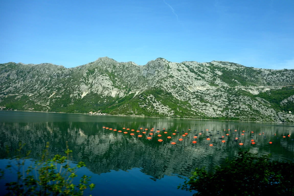 На воде множество огромных поплавков, расположенных правильными рядами. Их предназначение для ловли крабов или креветок. (Черногория)