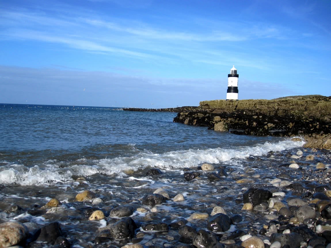 Атлантический океан. На берегу полосатый маяк. Берег из каменных валунов вулканической породы. Уэльс (Великобритания).