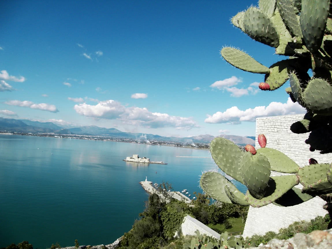 Вдоль берега Критского моря недалеко от города Нафплион тянутся заросли кактусов опунции. Они просто гиганты, к тому же ещё с красными плодами, которые даже съедобны. Здесь почти самая южная точка Греции.