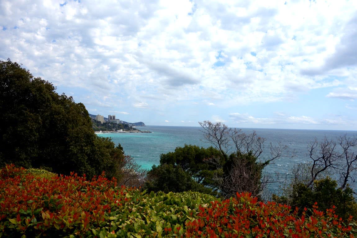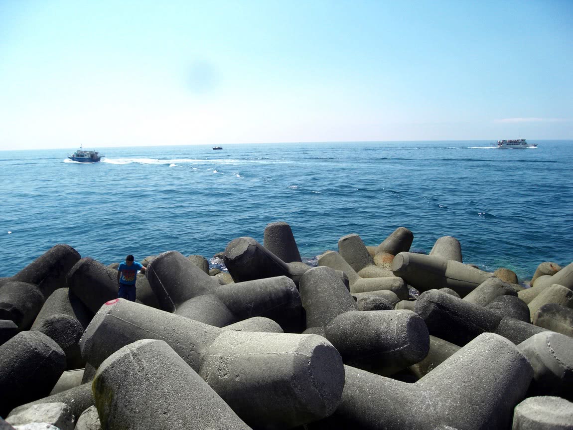Тирренское море у берегов Амальфи. Берег у города укреплён огромными бетонными конструкциями. (Италия)