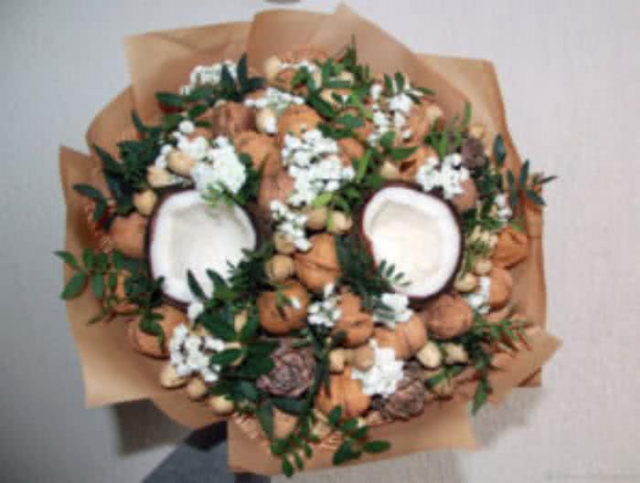 Для романтичных женщин подойдут букеты с орехами и лавандином. Собранный букет нужно будет упаковать в бумагу лавандового или светло-сиреневого оттенка.
