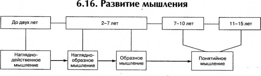 Перечисленные разновидности развиваются у человека последовательно. На ранних этапах (во младенчестве) ребенок начинает исследовать предметы, формируя наглядно-действенный образ мысли. Позже, в дошкольном возрасте, когда он уже умеет разглядывать картинки, воспринимать тексты песен и сказок, смотреть мультики, возникает фундамент для становления наглядно-образного способа осуществления мыслительной деятельности. Уже придя в школу или начав серьезное обучение чтению, вычислениям и письму, дети эффективно работают с абстракциями.