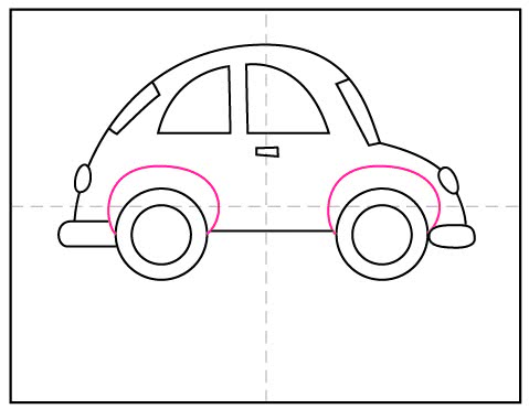 С помощью полуколец, изобразите арки колёс. С левой стороны прямоугольника очертите капот машины. Закруглите немного верхнюю часть трапеции. Нарисуйте заднюю часть машины.