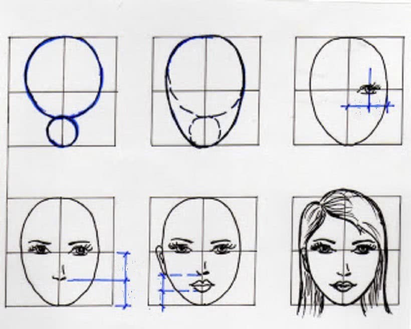 Бывает, что девочки рисуют в альбомах, но не знают, как красиво нарисовать лицо. На помощь придет несложная схема, где соблюдены правильные пропорции лица.