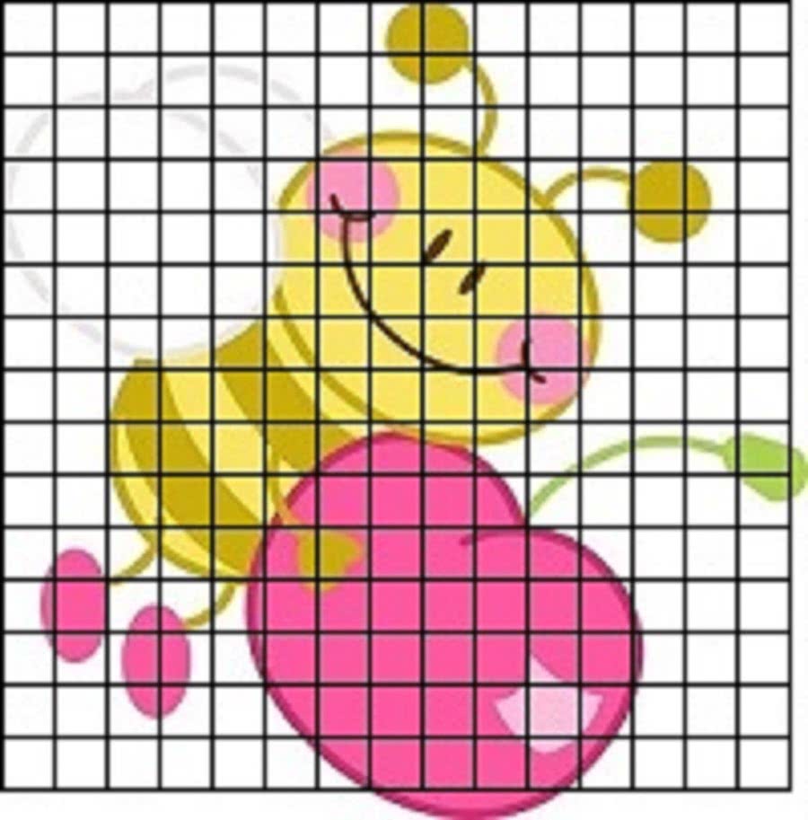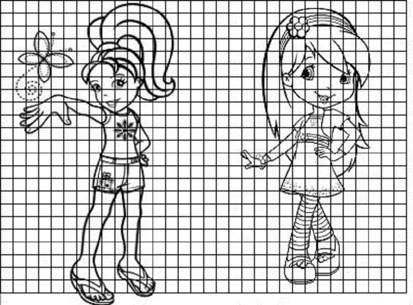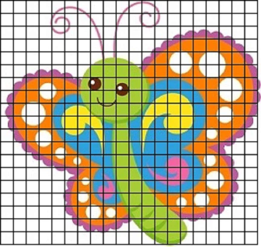 Рисунок посложнее с девочкой, бабочкой и клубникой. Тем не менее, если внимательно считать клеточки и по ним рисовать, успех гарантирован.