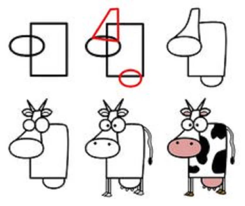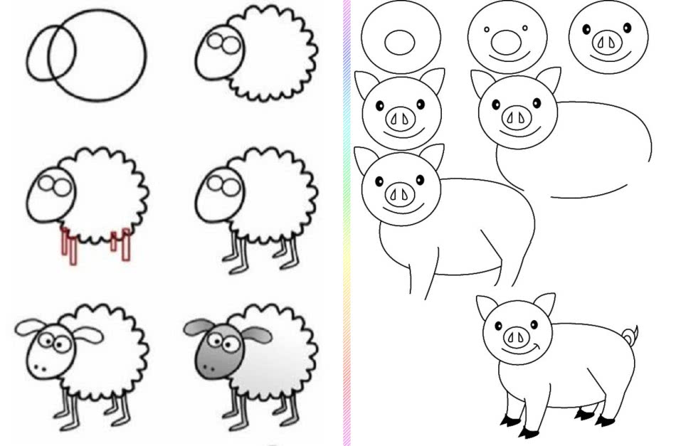 Домашние животные овца и свинья рисуются немножко по-разному. У свиньи сначала рисуют морду, а потом туловище. У овцы наоборот сначала туловище и в конце морду.