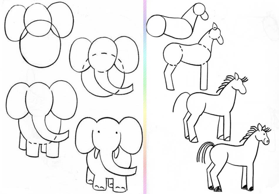 Рисунок слона и лошади смогут нарисовать все, кто умеет рисовать круги, овалы и прямоугольники.