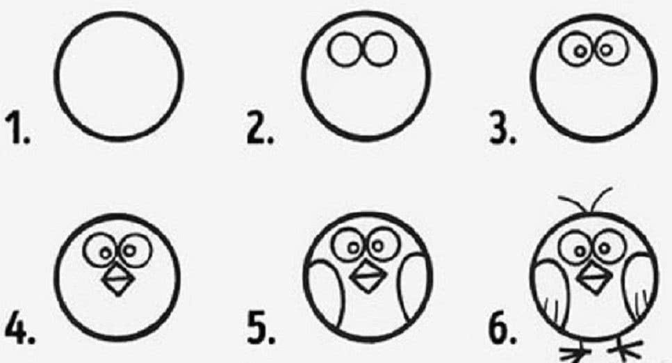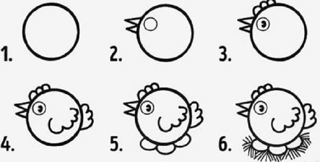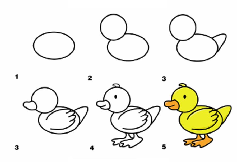 Чтобы нарисовать утенка достаточно к кругу пририсовать овал и дорисовать хвостик, клюв и глазки и крылья.