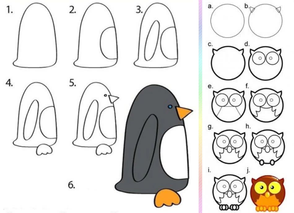 Не летающая птица холодных морей пингвин и лесная птица сова нарисованы поэтапно и раскрашены акварельными красками.