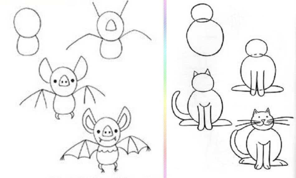 Нарисовать летучую мышь на первый взгляд кажется сложно, но если использовать технику поэтапного рисования, то эта симпатичная летучая мышь появится в вашем альбоме уже через 5 минут. Тоже два круга, но больший внизу, а меньший вверху помогут нарисовать кошку.