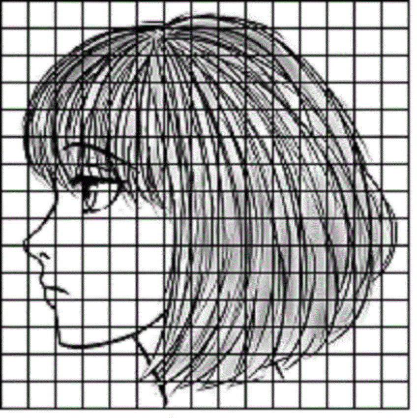 Портрет девочки в стиле аниме в профиль тоже подойдет для дневников девочек. Рисунок переносят по клеточкам, цвет прически и глаз нарисованной девочки зависит от пожеланий хозяйки дневника.