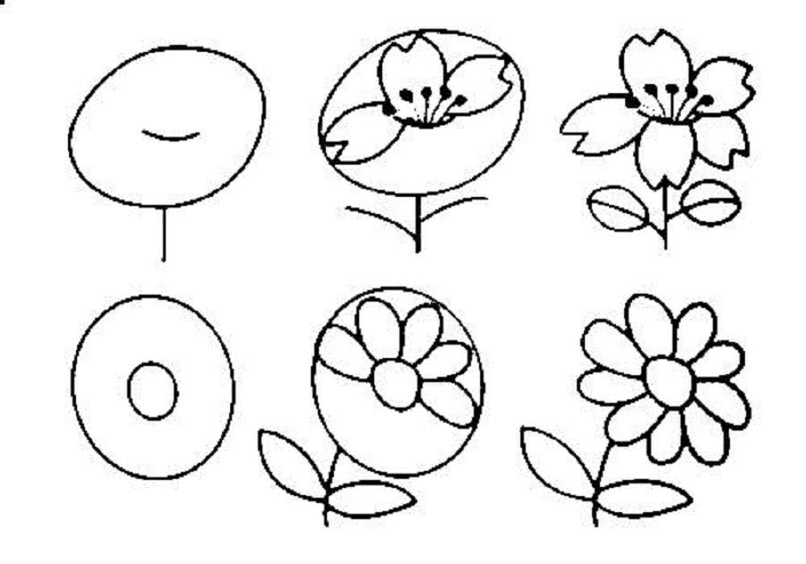 Цветы в альбомы тоже можно рисовать поэтапно. Чтобы цветок имел правильную форму достаточно сделать круг или овал и дорисовать центр и лепестки.