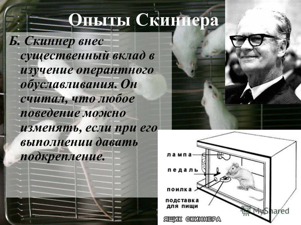Опыты Скиннера Б. Скиннер внес существенный вклад в изучение оперантного обуславливания. Он считал, что любое поведение можно изменять, если при его выполнении давать подкрепление.
